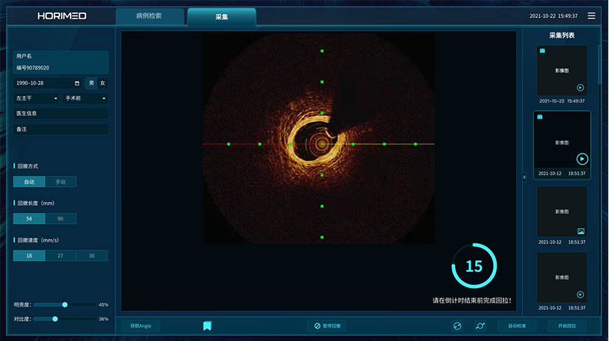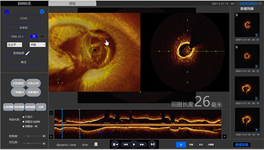 恒宇和藍藍設計合作,對OCT系統UI操作界面進行了創新,采用的UI界面結合了16:9寬屏優勢,搭載了管腔識別、支架識別、三維重建、造影融合等功能,軟件簡潔直觀的界面和多功能算法可幫助術者快速精準的做出診療決策,更符合國內醫生界面操作習慣,從而優化醫生和病人的診療體驗。