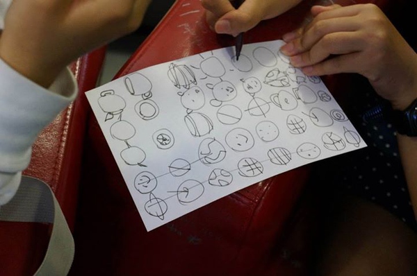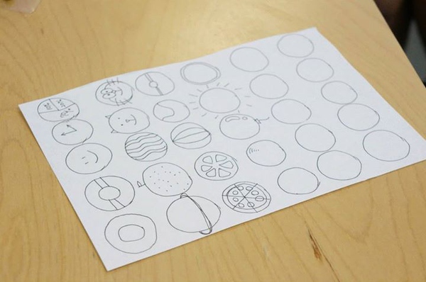 (這是在做頭腦風暴前的小練習,畫30個圓圈,然后盡可能地把每一個圓圈都賦予一個意義,變成不同的物件,這個聯系在很多關于頭腦風暴的工作坊里都有,Photo by Tatsuhiro Ohtani,VIA同事)