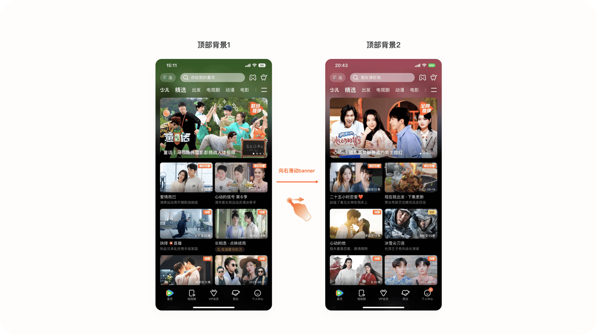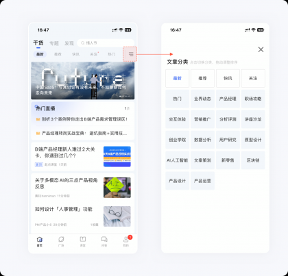 在頁面細節(jié)元素設(shè)計上,將角標樣式優(yōu)化為右側(cè)的書簽的樣式,整體感受更像現(xiàn)實生活中的書簽。在輔助標簽的設(shè)計上,將純文字樣式優(yōu)化為右側(cè)這種多彩面型的樣式,強化內(nèi)容的豐富和多元。