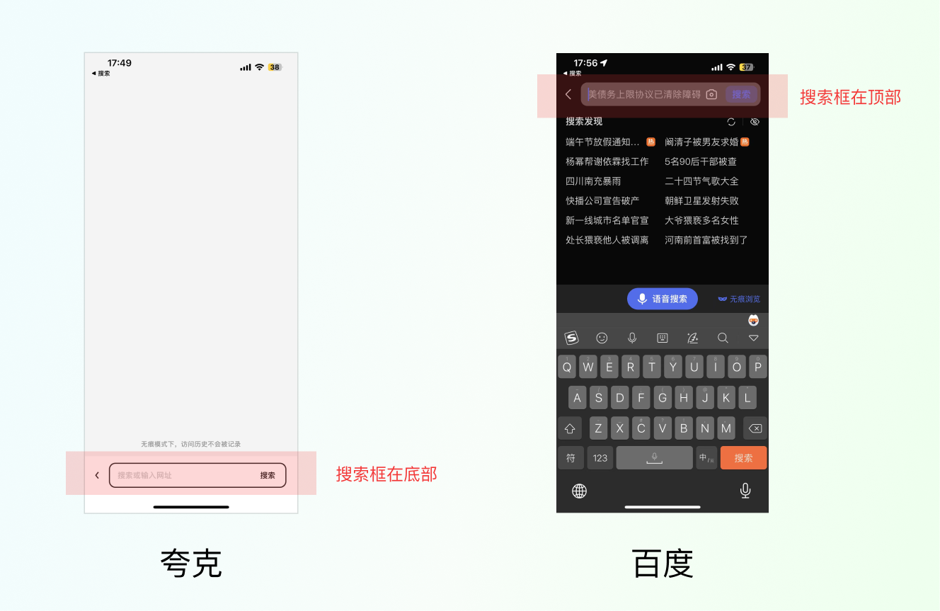 因為夸克想推翻傳統的瀏覽器,想打造一款更年輕更好用的瀏覽器,把搜索框放到下面也是滿足他們的業務訴求,現在手機屏幕越來越大,搜索框放在下面手指操作更加方便。所以,一定要先去了解業務。
