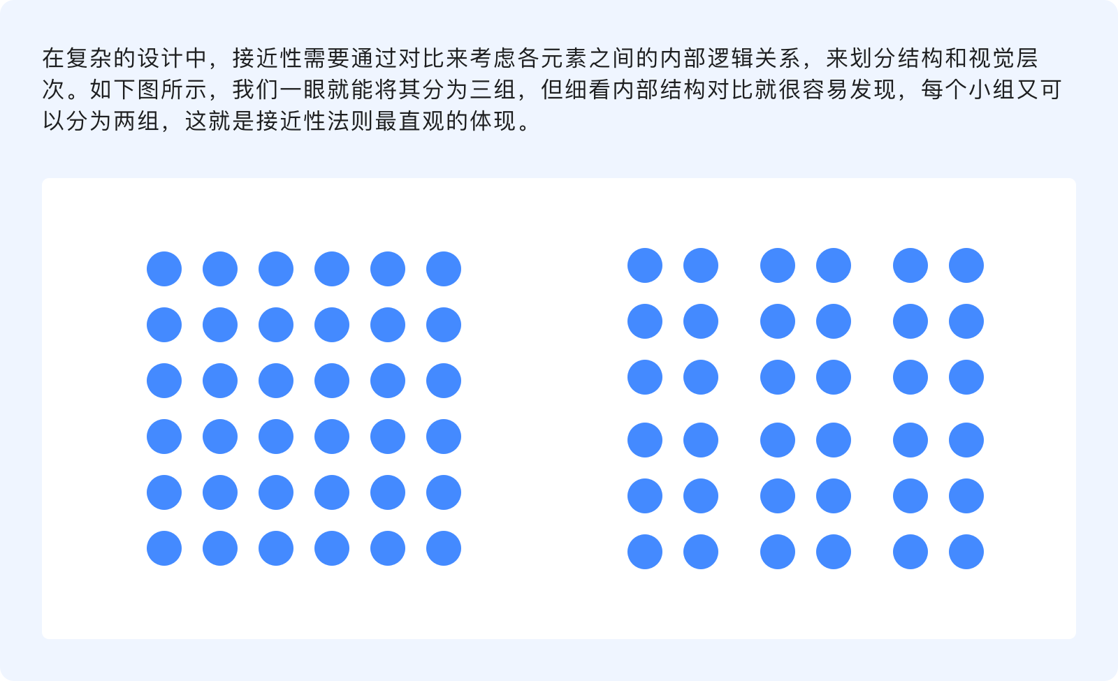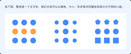 接近性原則指出,物體之間的相對(duì)距離會(huì)影響我們感知它們的關(guān)系,元素之間越是接近,組合在一起的可能性就越大,會(huì)被看作成一個(gè)整體,反之那些距離較遠(yuǎn)的則自動(dòng)劃分到組外。