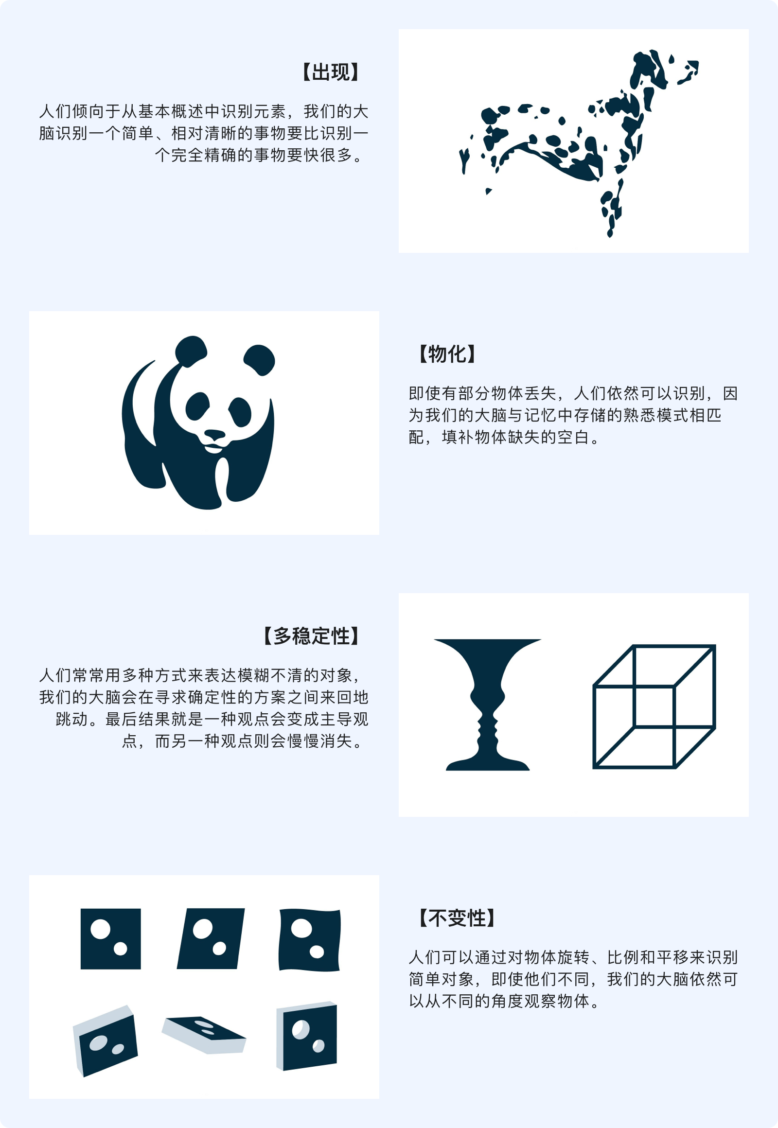 格式塔原理試圖解釋人們?cè)诤线m的情況下如何看待視覺(jué)元素。這些建立在四個(gè)關(guān)鍵想法上:【出現(xiàn)】、【物化】、【多穩(wěn)定性】、【不變性】。