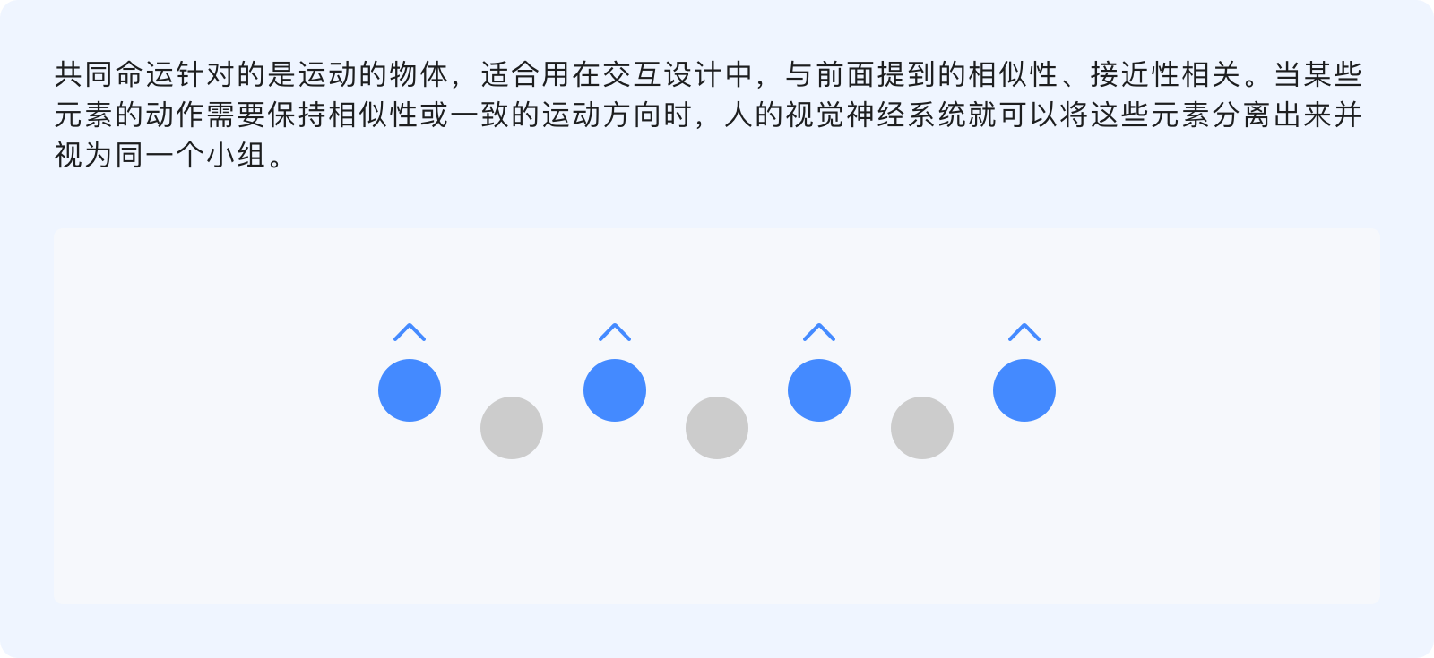 共同命運(yùn)原則指出,人們傾向于將具有共同運(yùn)動(dòng)形式的事物感知為一個(gè)彼此相關(guān)的整體,無(wú)論元素之間的距離有多遠(yuǎn)、或其他屬性(形狀、顏色、大小)各異,但只要沿著相同的方向、相同的速度運(yùn)動(dòng),共同命運(yùn)就會(huì)將其歸類。