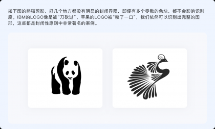 封閉性原則指出,人們的視覺(jué)系統(tǒng)傾向于將不完整的局部當(dāng)做一個(gè)整體來(lái)感知。看起來(lái)與連續(xù)性有諸多相似,不過(guò)連續(xù)性是通過(guò)物體的形狀和運(yùn)動(dòng)方向、按照視覺(jué)慣性來(lái)制定閉合規(guī)律,而封閉性則并無(wú)特定規(guī)律,只要把握好不完整物體的尺度、使各元素之間相互輔助,就能讓其與我們認(rèn)知模型中的原型匹配。