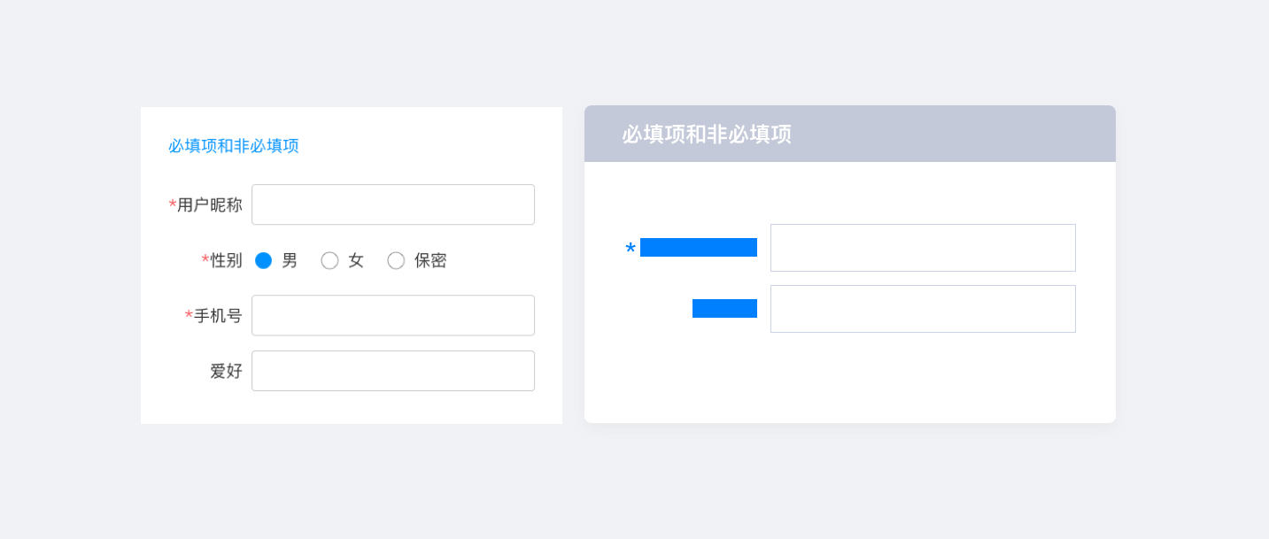 3.必填項(xiàng)指用戶必須要輸入的文本信息, 一般會用明確顏色凸顯, 非必填項(xiàng)一般是讓用戶選擇是否需要填寫。