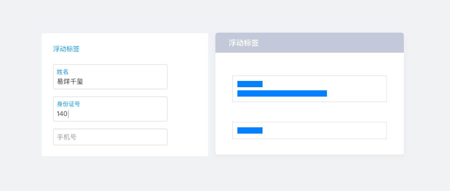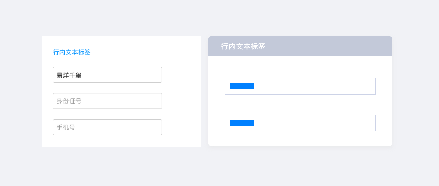 即標(biāo)簽位于輸入框內(nèi),擁有節(jié)約縱向和橫向空間的優(yōu)勢。行內(nèi)標(biāo)簽可分為齊行內(nèi)文本標(biāo)簽,行內(nèi)圖標(biāo)標(biāo)簽,浮動標(biāo)簽