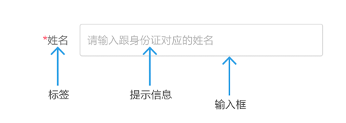 一個輸入框,通常有標簽名稱label、提示信息placeholder(輸入信息后提示文字消失)、初始值value(需手動刪除)。如果是必填表單,在適當位置(標簽的前后,輸入框后)加上紅色*號(或其他符號)