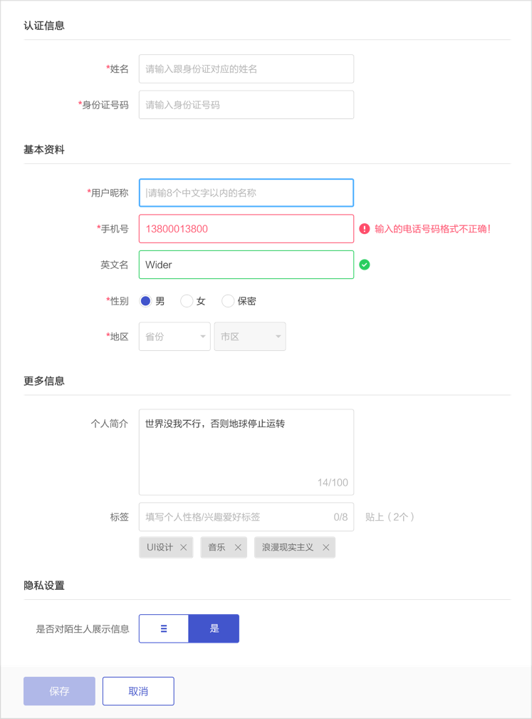 當輸入有誤時,盡量避免彈出框提示,可以直接對輸入框設計不同的狀態顯示默認狀態、選中狀態、錯誤狀態、成功狀態。
