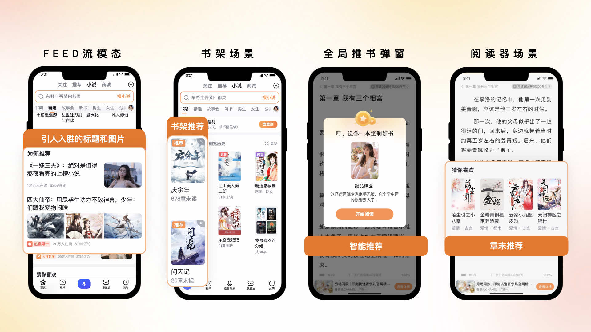 在推薦形式上,我們也采用了多樣化的推薦方式。例如在首頁增加了feed流形態的信息模塊,以更直觀的圖文展現方式,幫助用戶發現他感興趣的內容。在書架場景,針對于書架內容少的用戶,自動的放置兩本高流量書籍,幫助用戶高效的觸達內容。與此同時,我們還會根據用戶行為數據,采用彈窗形式和章尾推薦等形式主動向用戶推薦與其喜好度高的內容,方便用戶高效的觸達他感興趣的內容。
