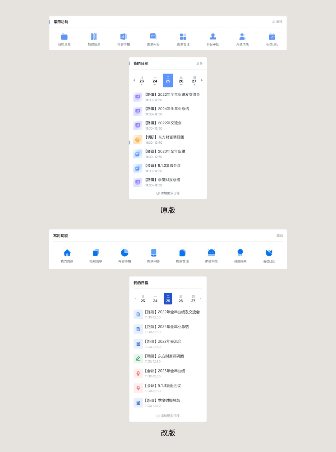 在快速入口和日程模塊中,都有使用裝飾圖標,顯然大家也能理解他們對于目前的語境來講還是細節過多了,所以需要做一些調整,讓它們簡化。
