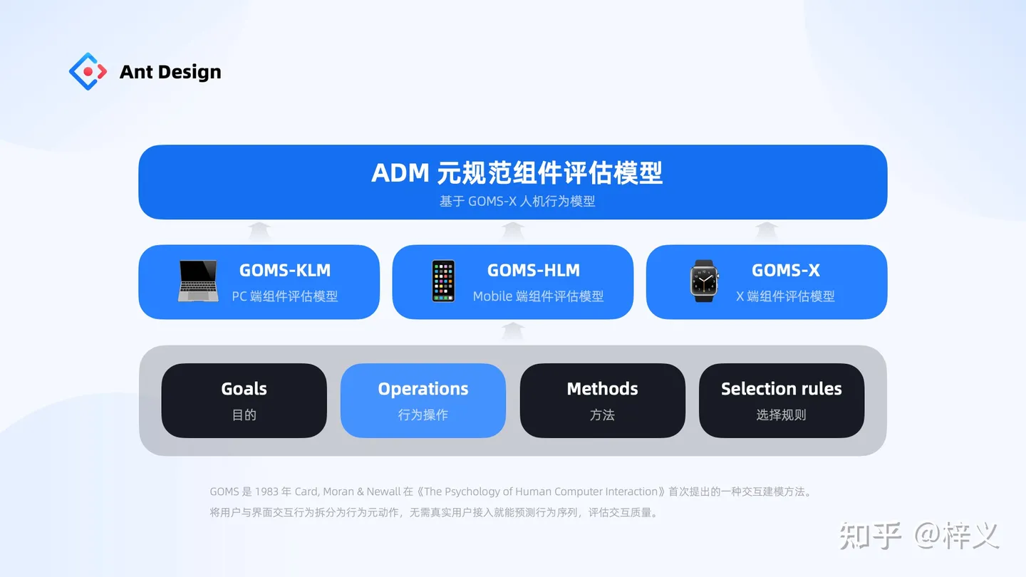 ADM 元規范的組件評估模式正式基于 GOMS 人機交互模型演變而來。GOMS 是 1983 年 Card 等人在《The Psychology of Huamn Computer Interaction》首次提出的一種交互建模方法,它的核心理念是將用戶與界面交互行為拆解為行為元動作,無需真實用戶介入就能預測交互行為的序列,評估交互的質量。