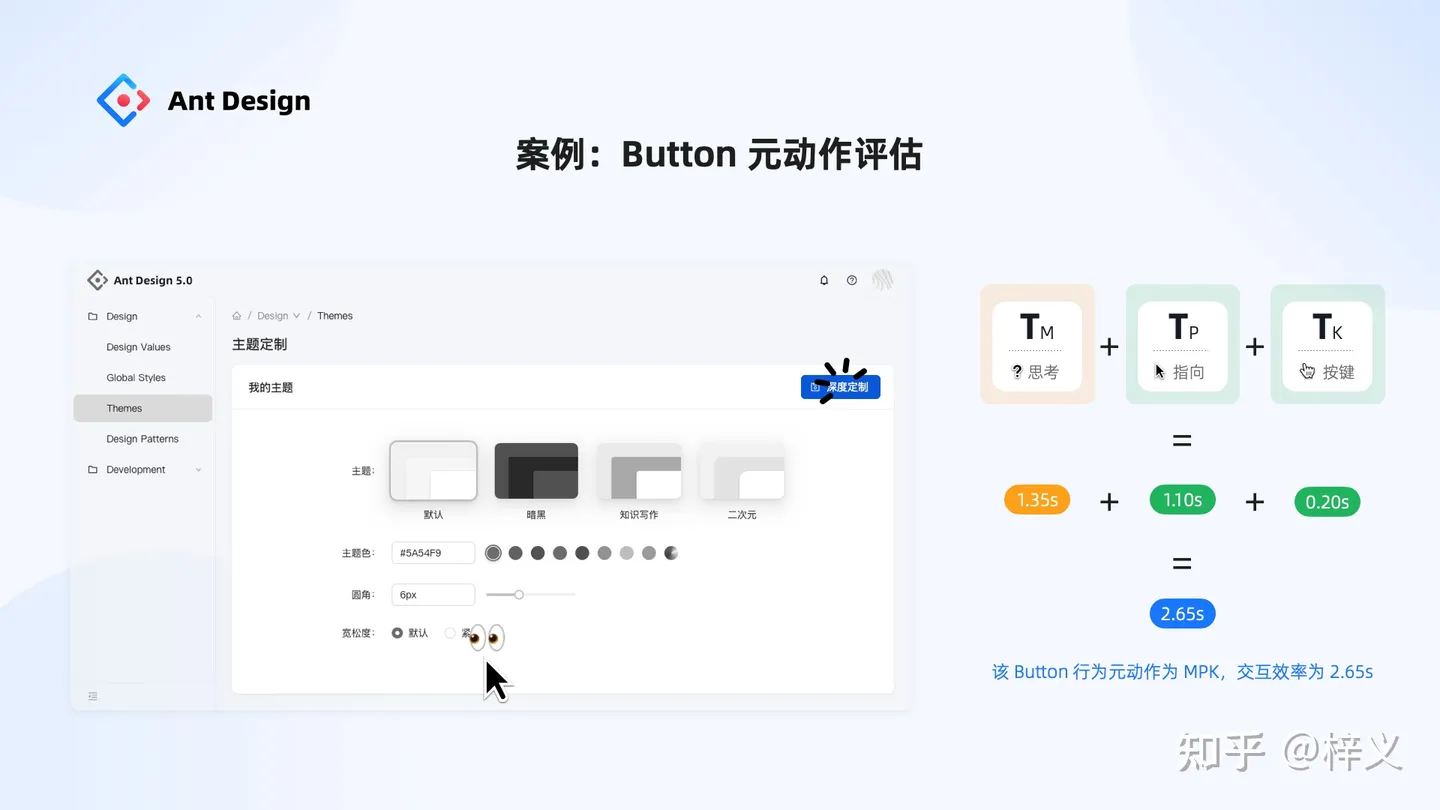 如此,我們定義了按鈕的交互行為序列為 MPK。更進一步,如果我們能測得這些元動作的交互效率,我們就能得到按鈕這個組件的交互質量了。