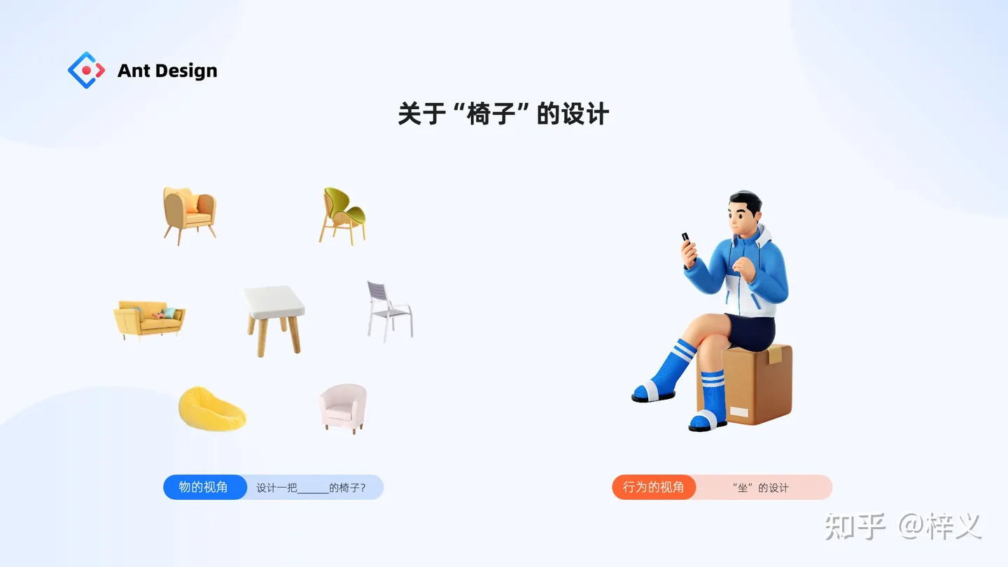 老師接著說,所謂椅子的設計,不是要我們去思考要設計“什么顏色的椅子”、“什么材質的椅子” 抑或 “什么形狀的椅子”。他希望我們回歸用戶去思考,設計椅子的初衷究竟是為了什么?是為了滿足用戶“坐”這個行為目的。
