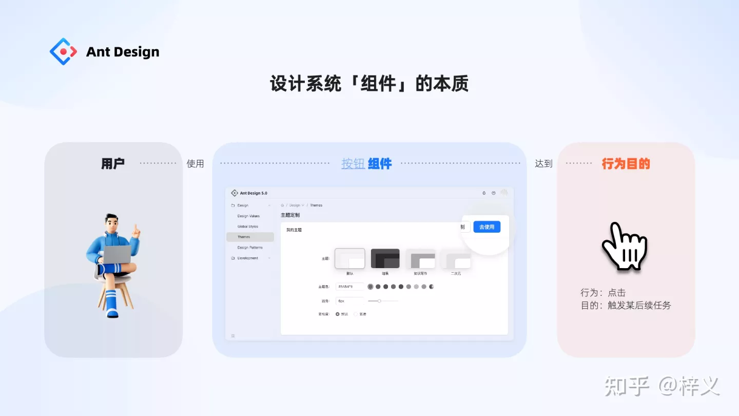 其實,為設計系統設計一個組件,一樣如此。用戶通過界面使用我們的組件,并非為了用而用,而是為了達到他的某種行為目的。如果我們回歸到這樣一個簡單的本質,那么對于組件的定義可能就十分清晰了。