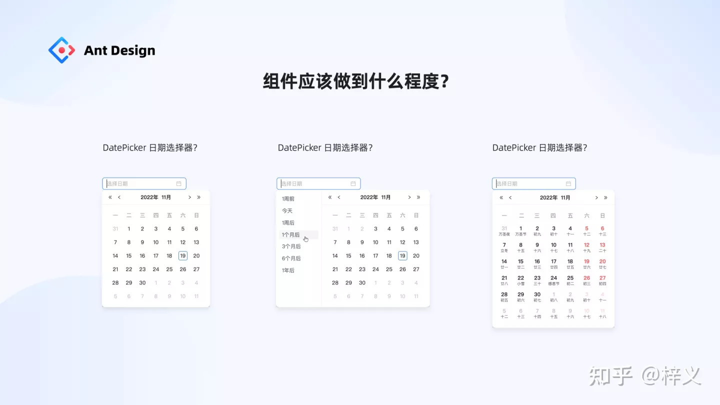 第二個問題,同樣都是日期選擇器組件,理論上它可以承載很多功能,那么,我們在設計系統里應該做到何種程度才算合適呢?