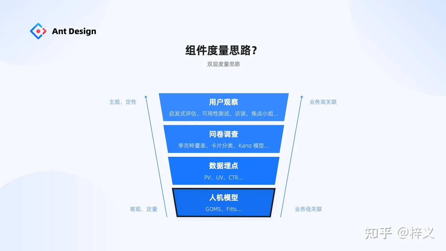在設計研究領域,調研思路可抽象為以下幾類。第一 part 提到組件的本質是「行為的規范」,因此對組件的評估,我們同樣聚焦到如何評估「組件行為」這個本質事情上。因此我們選擇更客觀、獨立于業務的底層的人機交互模型,通過它評估而來的結果能 100% 客觀反饋交互行為的質量。