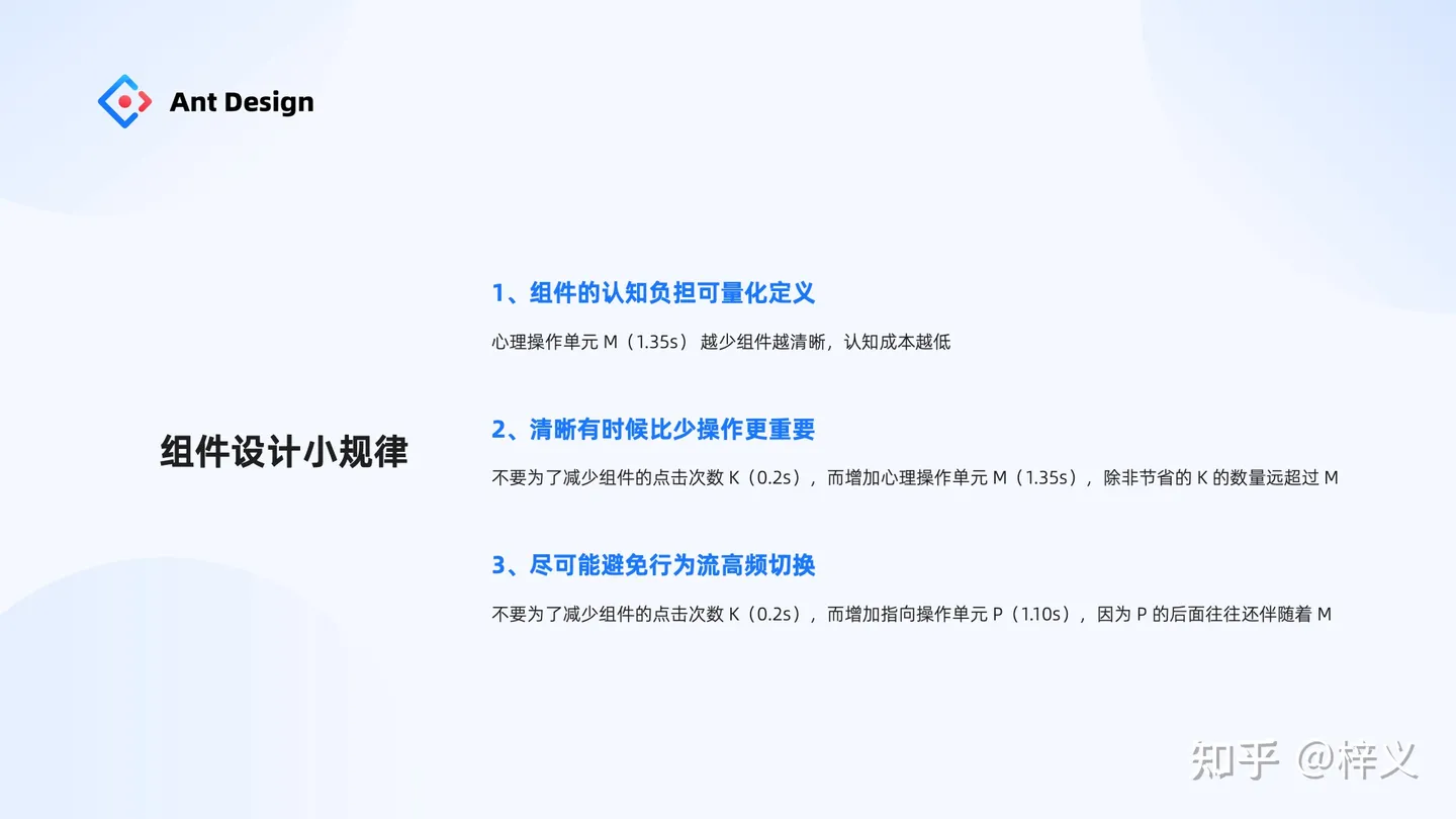 在螞蟻內部,我們還將原規范應用到其它設計系統的建設當中。比如,Ant Design Mobile 5.0 今年引來大版本的更新,從 200+ 的冗余組件收斂成了 68 個通用組件,同時通過評估發現其組件質量也提升了不少,系統中單組件平均交互行為耗時從 3.42 降到了 3.17,高于業界平均。