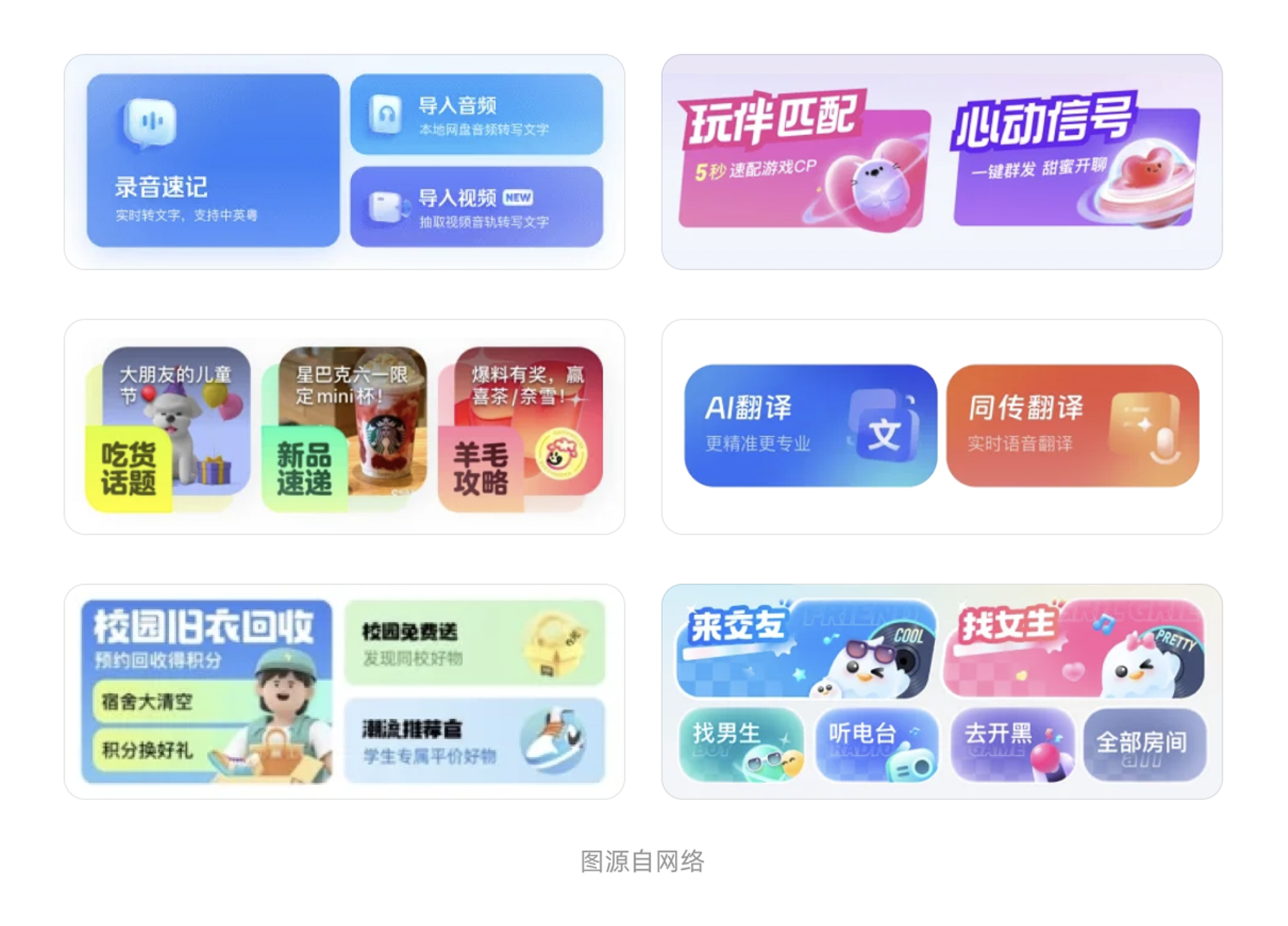 1、我們可以根據瓷片區數量靈活排版,選取1-2個核心功能放大展示,讓模塊形成“大-中-小”有節奏感的布局: