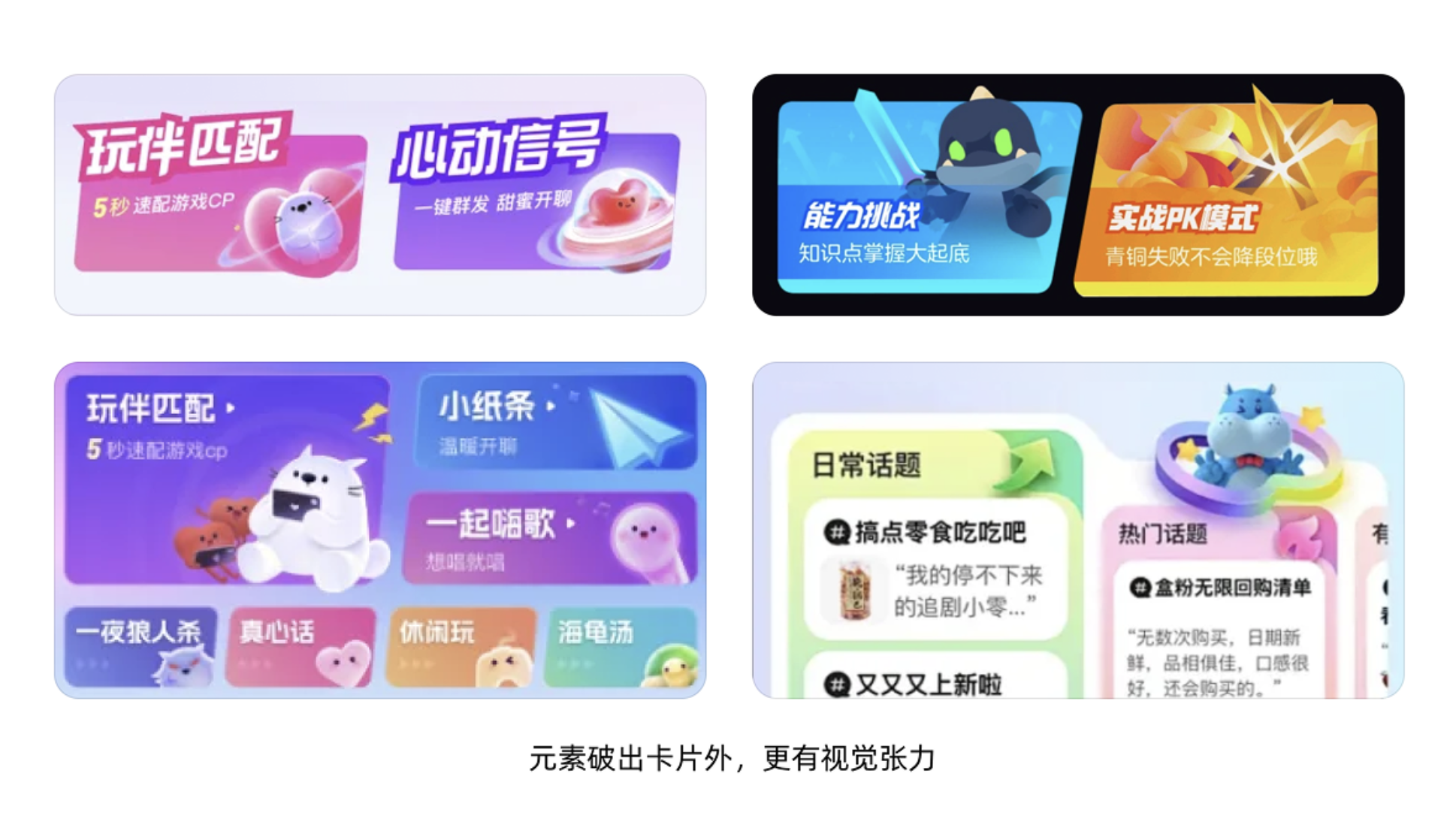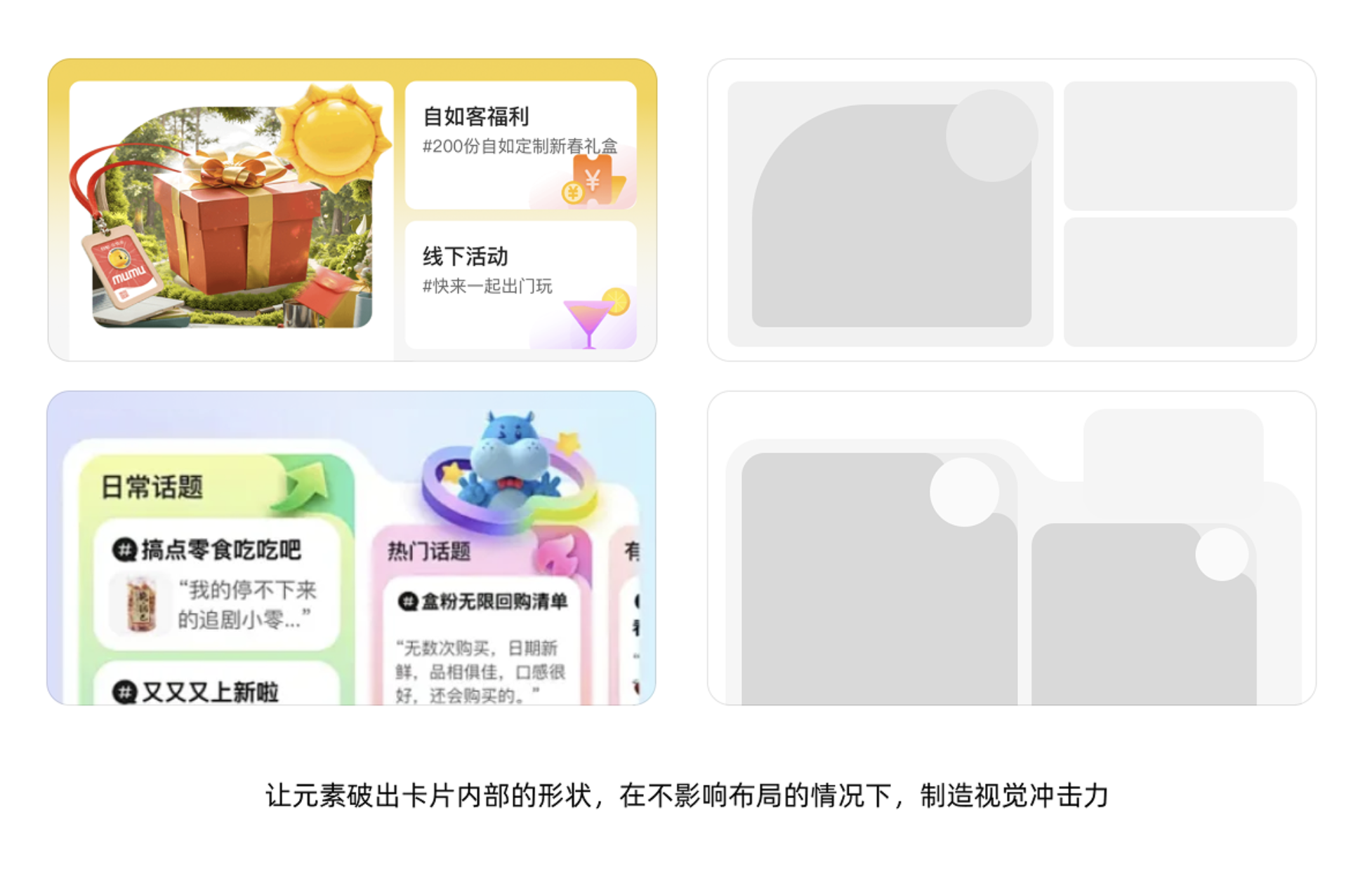 除了直接破型以外,我們還可以在卡片內部制造形狀,讓元素突破形狀,這樣不會打破整體的布局,也能營造視覺沖擊力: