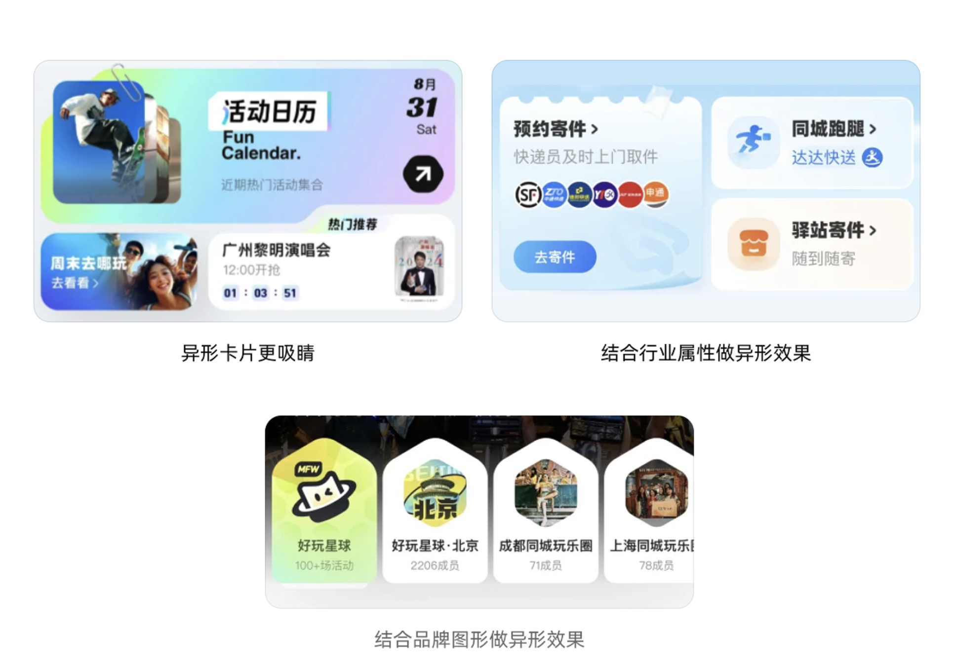 讓卡片脫穎而出的不止傾斜,我們還可以給卡片做出異形效果,用「不規則」的圖形激活用戶感官敏銳度: