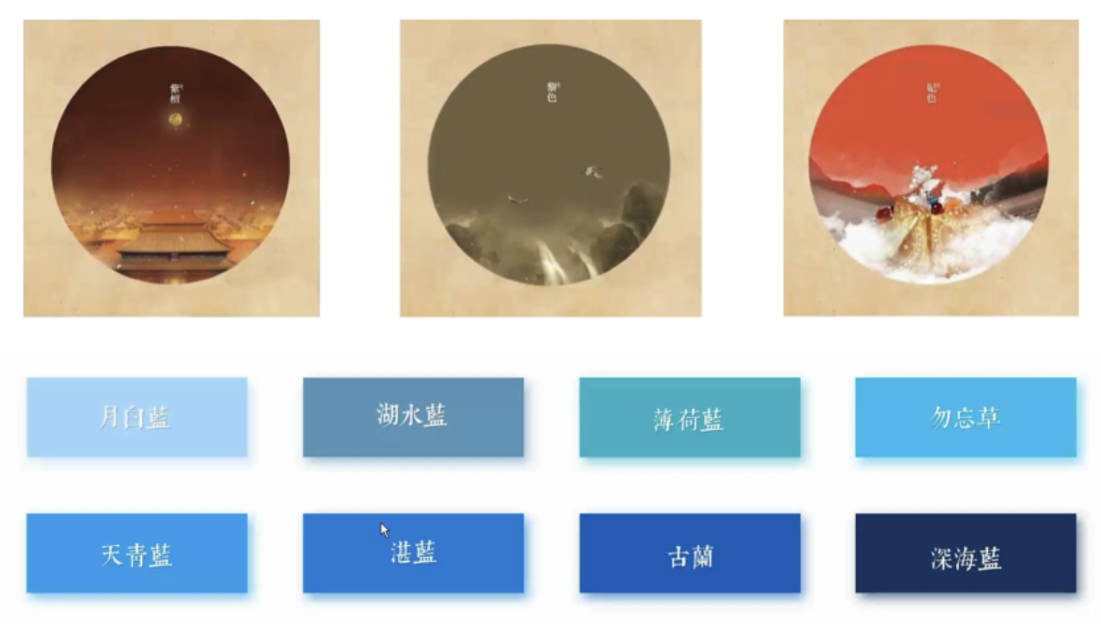 • 中國風色彩示例:月白藍、湖水藍、勿忘草、天青藍、薄荷藍、洪藍、古蘭、深海藍。