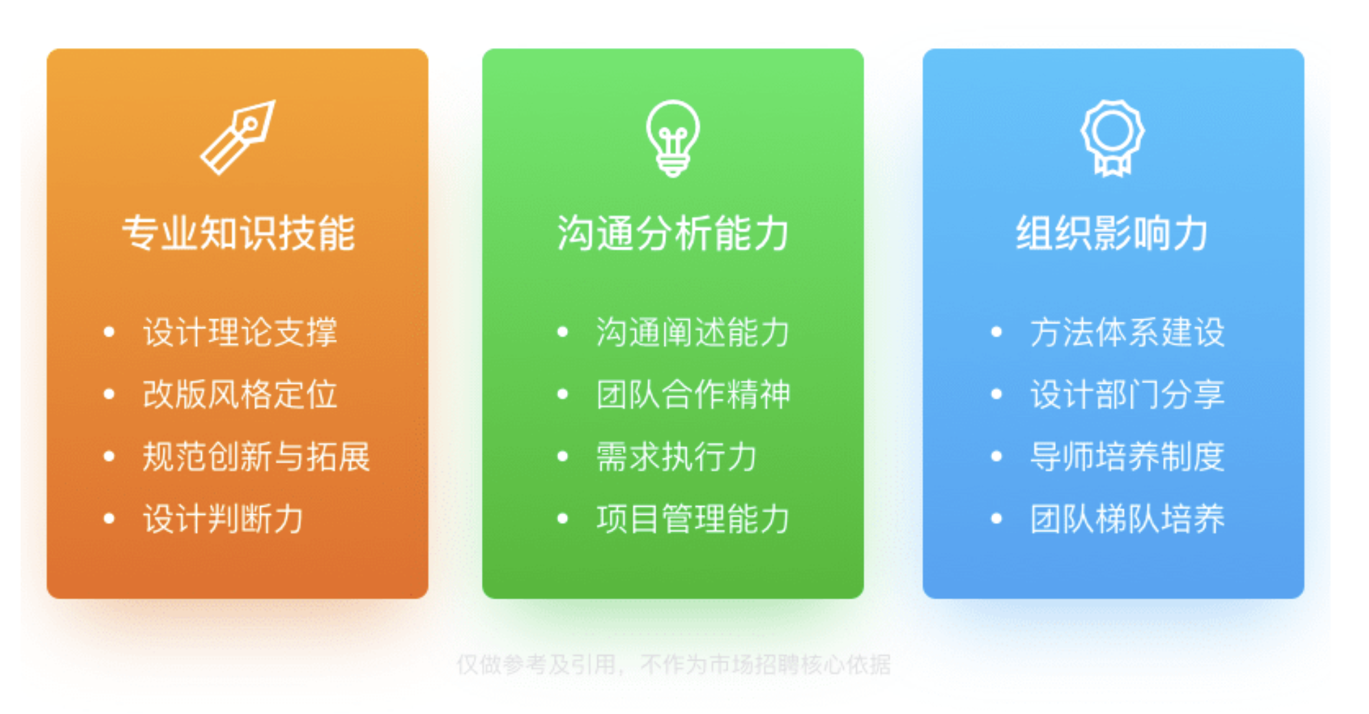• 一二線設計梯隊(如 BAT、美團、小米等)的能力指標體系涵蓋多方面,包括專業知識技能(改版風格定位、規范創新與拓展、設計判斷力等)、溝通分析能力(溝通闡述能力、需求執行力、團隊合作精神等)、組織影響力(方法體系建設、設計部門分享、導師培養制度等)、團隊管理、項目管理、團隊梯隊培養等。
