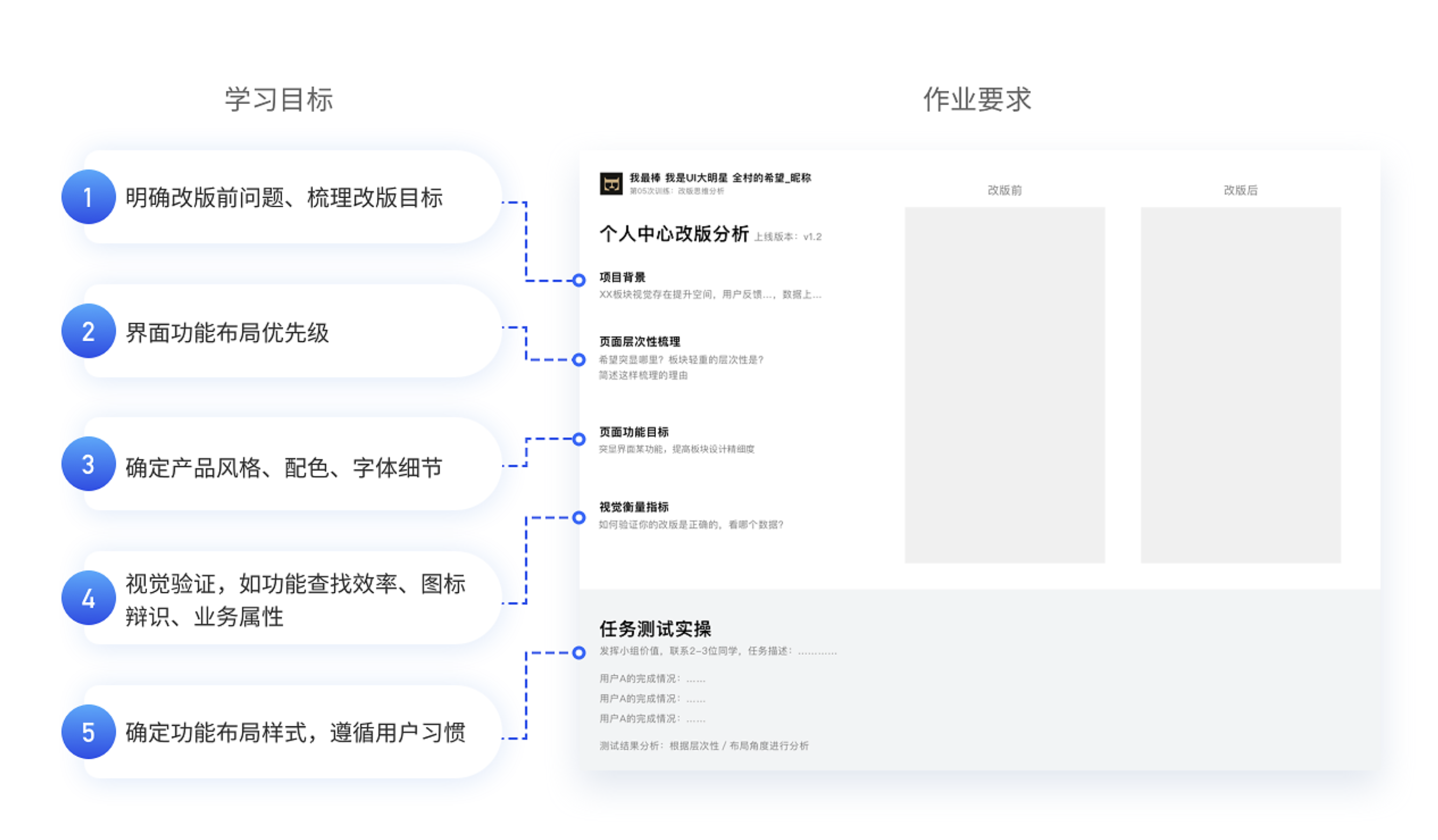 • 科學的作業(yè)體系包括明確改版前的問題、梳理改版目標、確定頁面層次性和功能目標、進行任務測試等,從每次作業(yè)中培養(yǎng)設計思維。