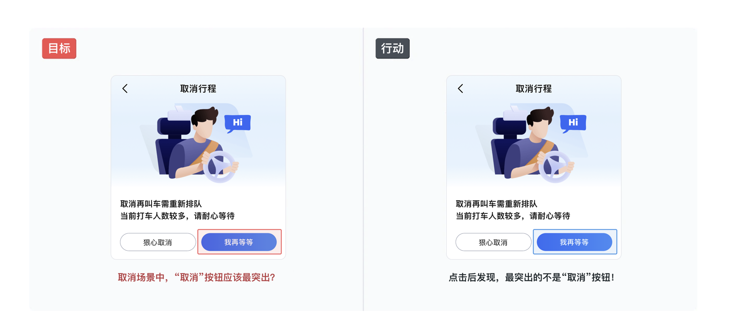 比如看到 APP 里一個顯眼的紅色按鈕,以為是 “返回”,點擊后卻發現是 “提交訂單”;在打車軟件里,把 “狠心取消” 當成 “查看詳情”。這種錯誤源于 “規劃階段”,是界面信息混亂、層級不清晰導致的 —— 用戶不是手滑,是被設計 “誤導” 了。