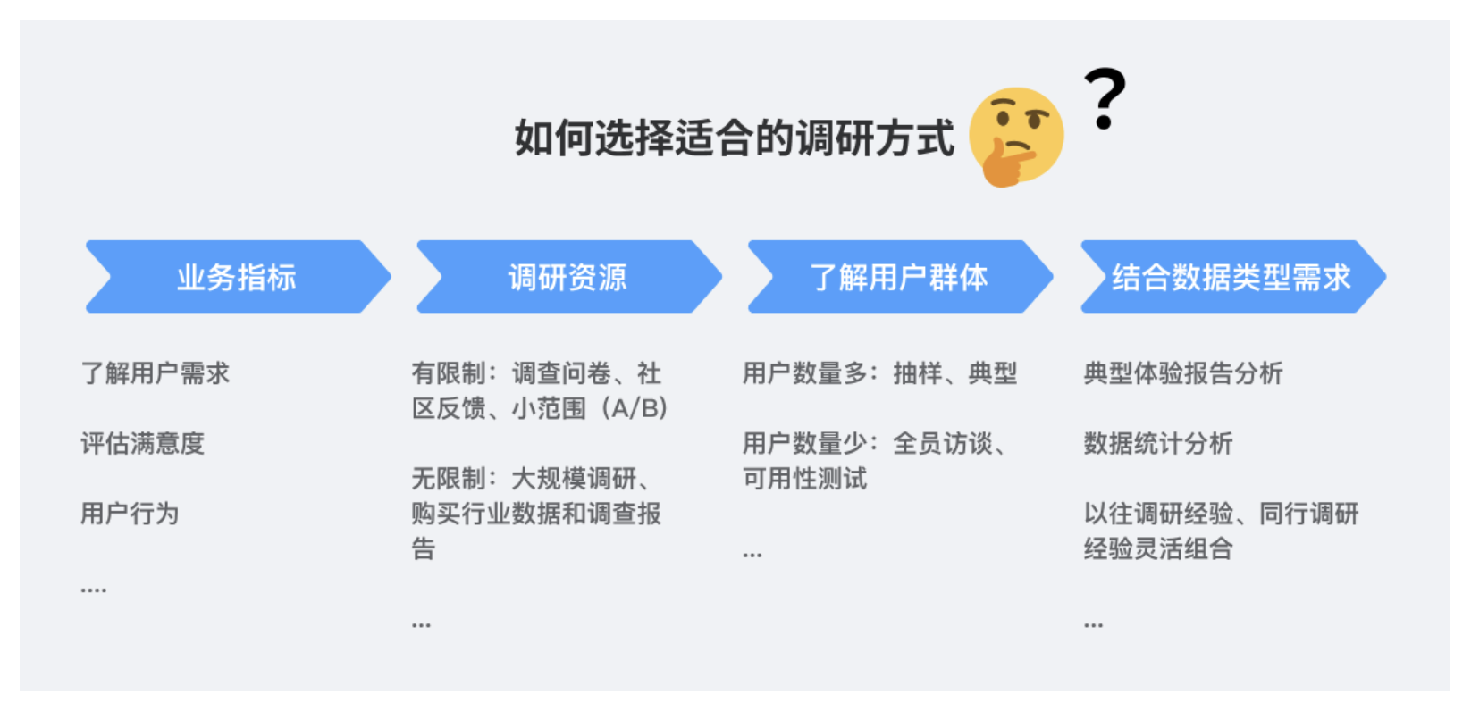 難點在于 “資源有限”—— 不可能每次都做全所有調(diào)研,需根據(jù)目標選方法:比如要快速了解 “新用戶注冊痛點”,選 10 個典型新用戶做訪談,比做 1000 份問卷更高效。