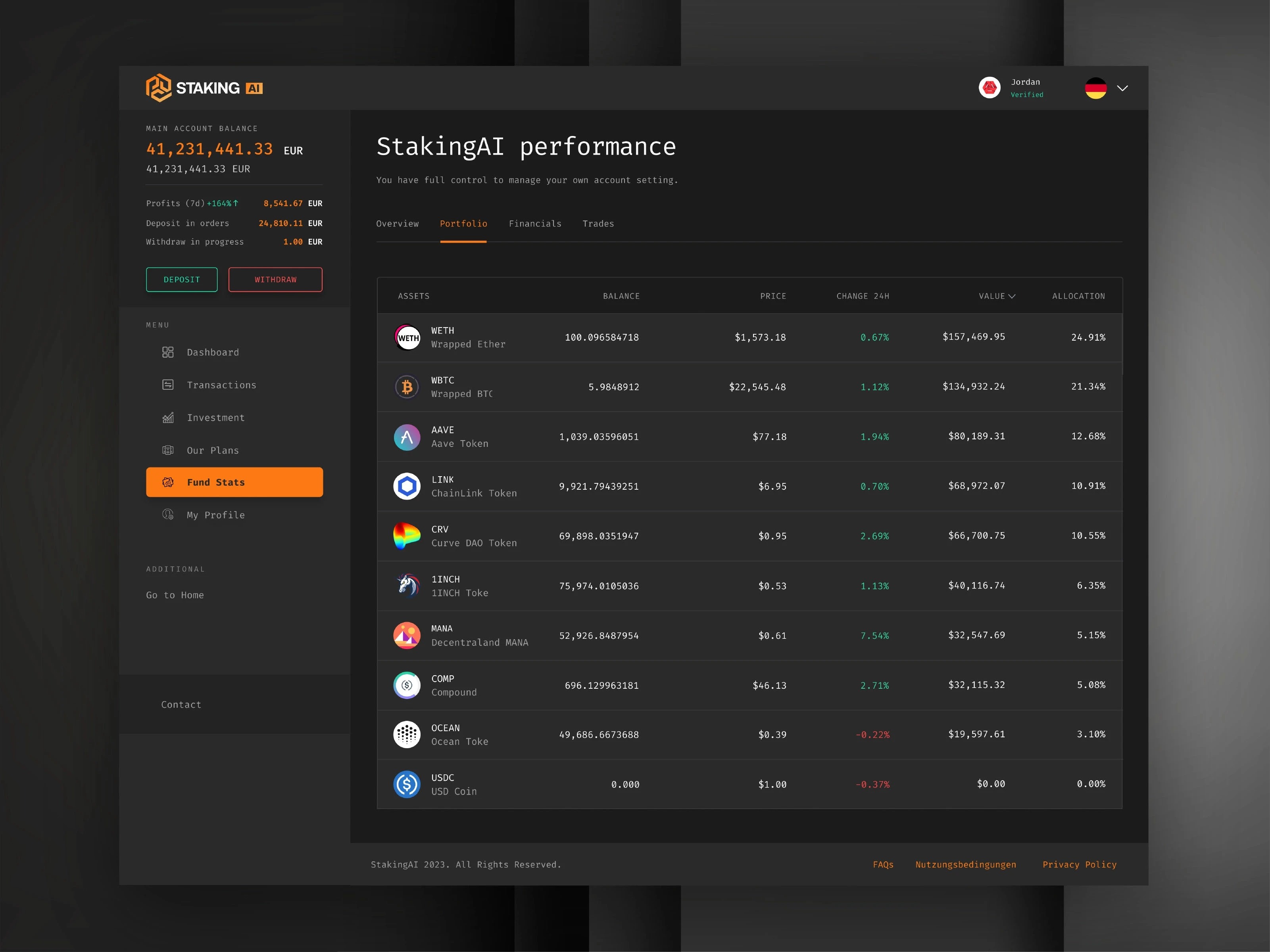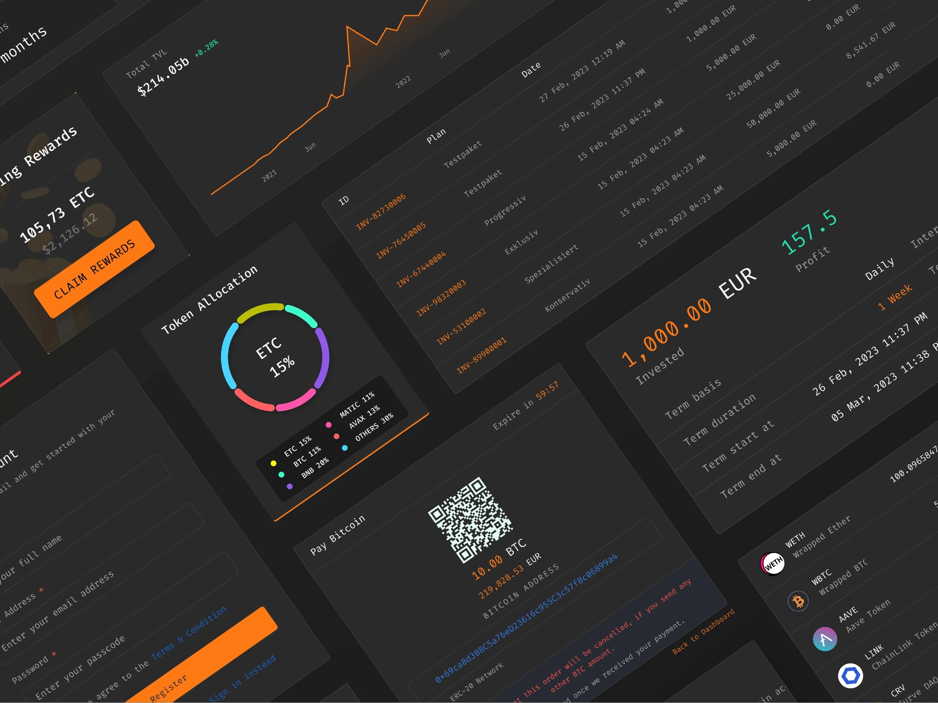 功能邏輯:聚焦 “投資全流程管理”,從資產充值、投資計劃、收益跟蹤到資產配置,全鏈路覆蓋;通過圖表(折線圖、環(huán)形圖)、數(shù)據(jù)卡片直觀呈現(xiàn)投資收益、資產波動、代幣占比等關鍵信息,助力用戶快速決策。