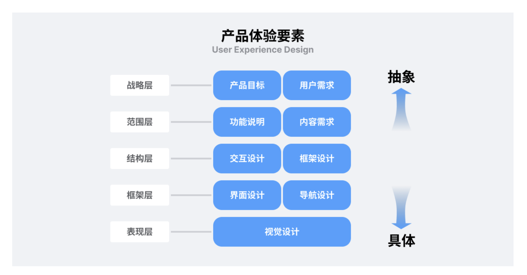要理解它的核心,繞不開(kāi)經(jīng)典的產(chǎn)品體驗(yàn)五層級(jí)模型。這五個(gè)層級(jí)從抽象到具體,像搭建一座房子一樣層層遞進(jìn),少了任何一層,體驗(yàn)都會(huì) “塌掉”: