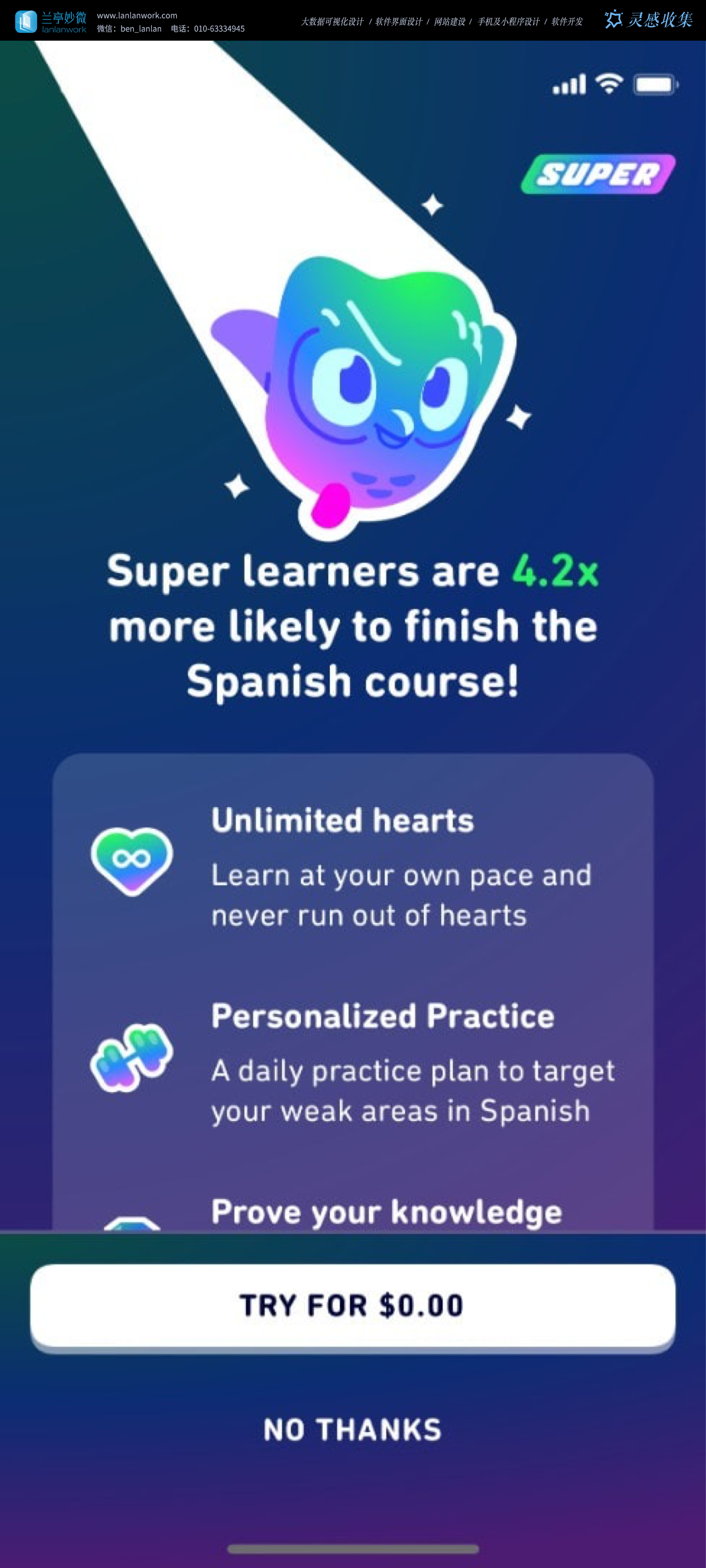 在視覺風格上,語言學習類界面用漸變色彩和卡通形象營造活潑氛圍,工具類則以黑黃撞色凸顯專業感;信息架構上都遵循 “價值傳遞 - 選項展示 - 行動引導” 邏輯,或通過量化數據、功能列表展現付費價值,或通過試用周期、套餐對比、功能表格降低決策門檻;交互設計突出 “免費試用” 按鈕,利用色彩對比引導視覺焦點,同時在試用規則上強化用戶安全感。整體通過場景化視覺、分層信息傳遞與安全感交互細節,構建從認知到轉化的完整路徑,為訂閱制產品商業化設計提供多元參考。