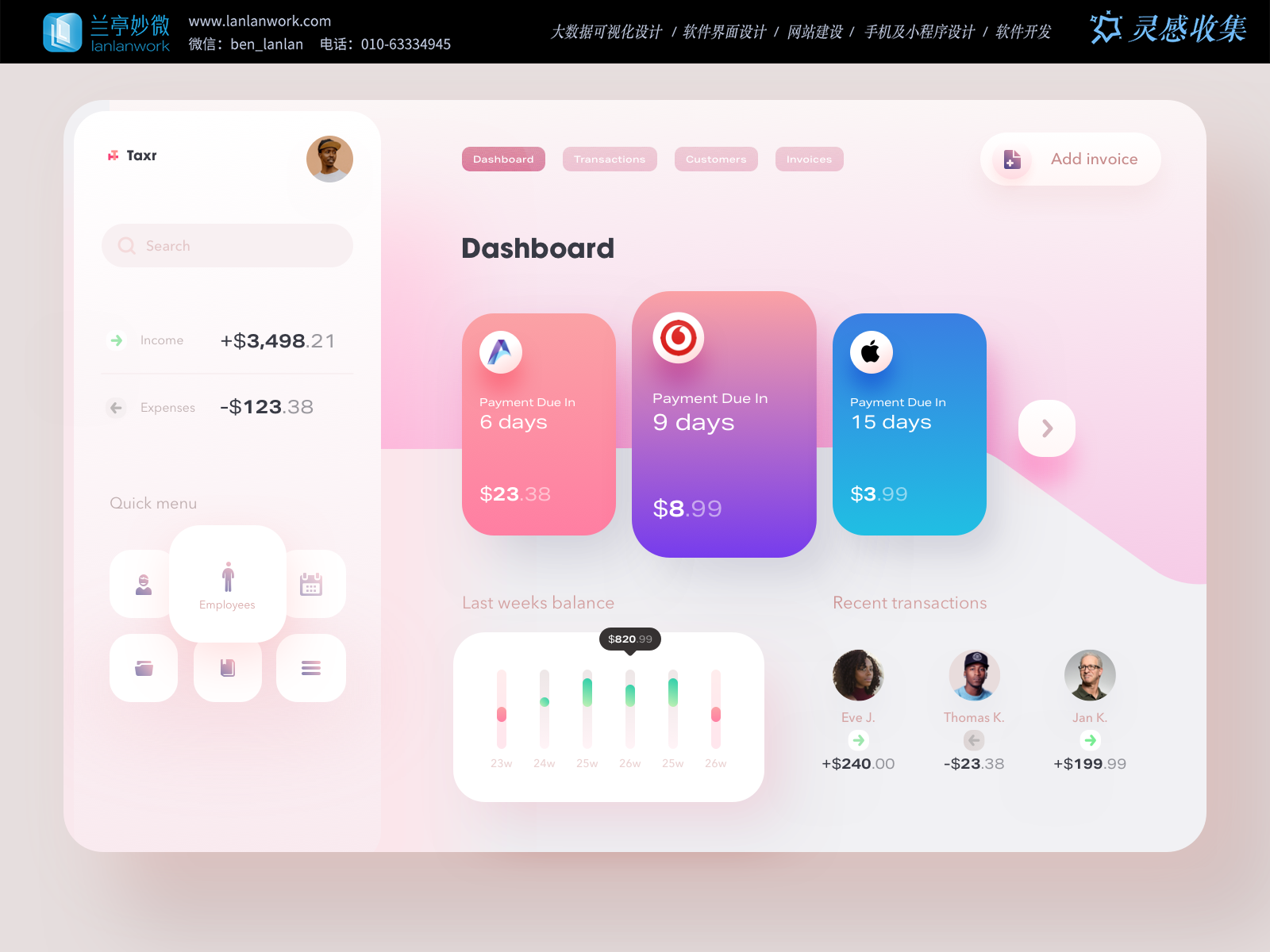 財務工具常陷入 “深藍黑灰 + 嚴肅排版” 的刻板印象,而 Taxr 選擇低飽和粉紫漸變 + 柔白基底的視覺體系,重新定義了財務界面的情緒基調:主色調以 “粉 - 紫 - 藍” 的漸變色塊區分核心財務模塊,既通過色彩編碼讓 “待收賬款” 的優先級(粉色 > 紫色 > 藍色)直觀可感,又以柔和的色調消解了財務數據的 “壓迫感”—— 色彩心理學中,粉色關聯 “關注”、紫色關聯 “提醒”、藍色關聯 “常規”,恰好匹配不同賬期的管理需求。