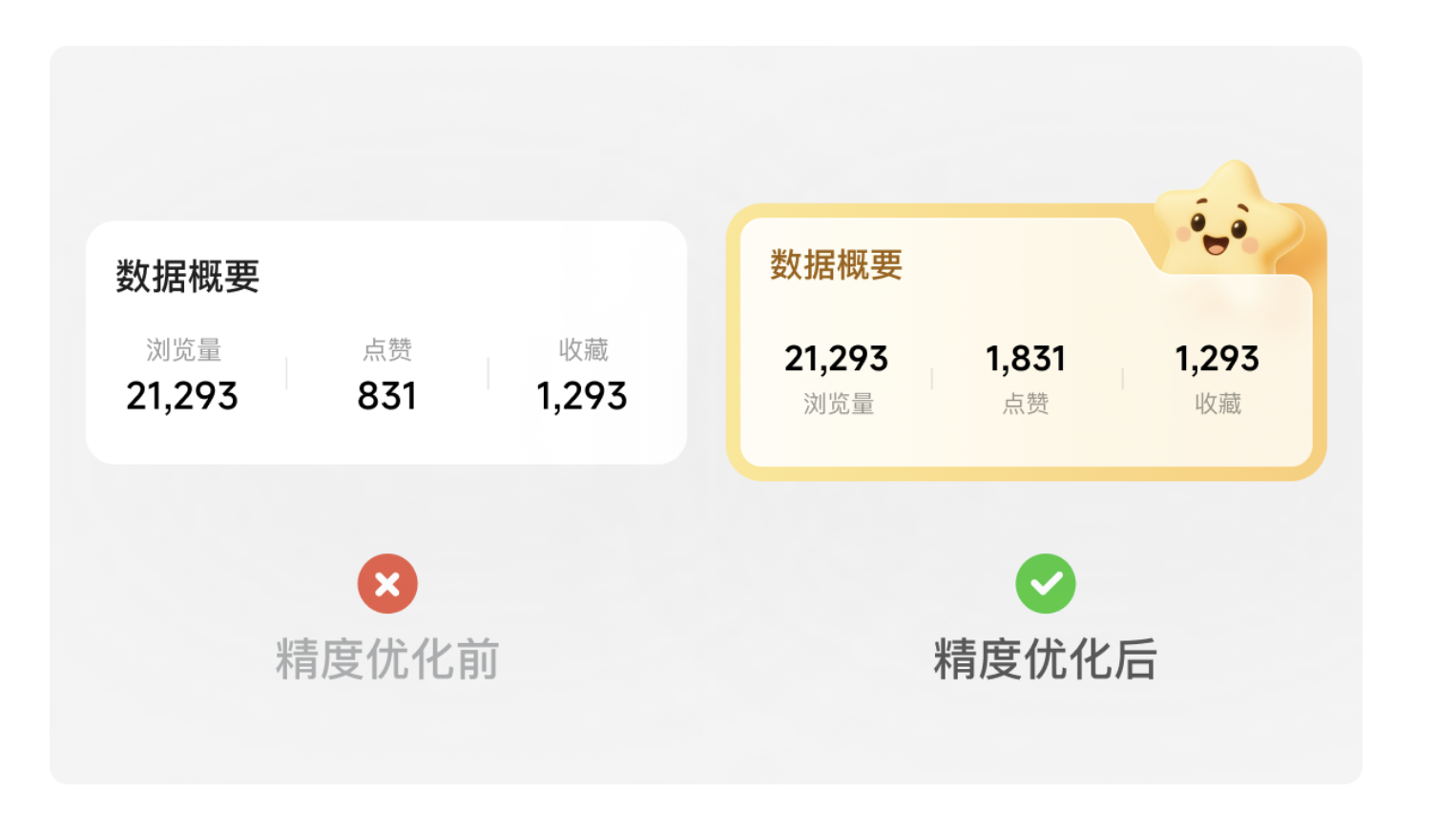 - 調(diào)整信息排版邏輯:將數(shù)據(jù)作為視覺核心,文字說明置于數(shù)字下方,符合用戶 “先看結(jié)果再看說明” 的閱讀習慣,比如 “瀏覽量” 文字放在 “21,293” 下方,讓數(shù)據(jù)一目了然。
