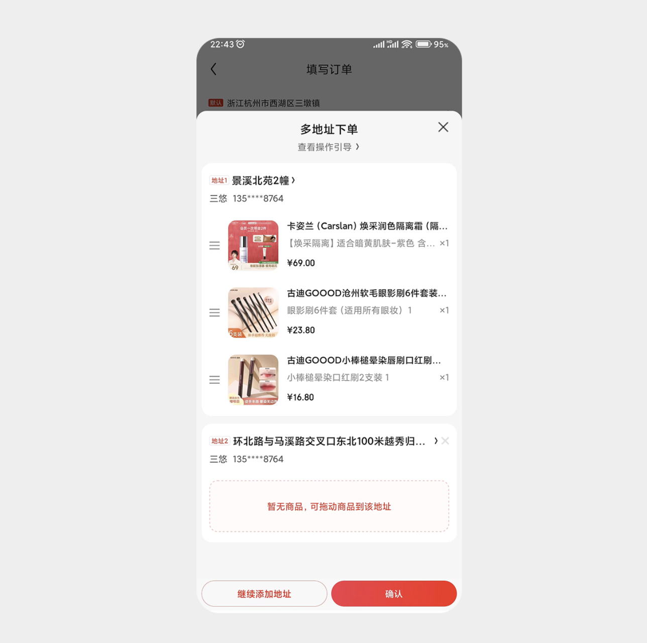拖拽手勢(shì)是高效分配類(lèi)場(chǎng)景的優(yōu)選方案。例如電商平臺(tái)的多地址下單功能,用戶(hù)可直接拖拽商品至不同收貨地址欄,實(shí)現(xiàn)一鍵分配,避免重復(fù)勾選或填寫(xiě)的繁瑣操作。這種設(shè)計(jì)將抽象的 "商品分配" 需求轉(zhuǎn)化為具象的拖拽動(dòng)作,操作路徑清晰,同時(shí)配合地址欄的空狀態(tài)提示,讓用戶(hù)實(shí)時(shí)掌握分配進(jìn)度,大幅提升下單效率。