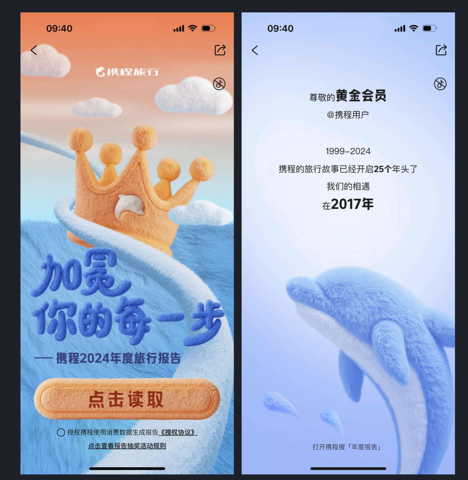 年度報告已成為產品與用戶情感連接的重要載體,而獨特的設計風格能讓這份連接更具溫度。攜程旅行 2024 年度旅行報告以毛茸茸的設計語言貫穿始終,從圖標、字體到背景、按鈕,每一處細節(jié)都透著柔軟細膩的質感,在寒冬時節(jié)給用戶帶來別樣溫暖。報告不僅呈現了用戶 8 年探訪 15 座城市、足跡 5 萬公里的硬核數據,更通過 "加冕你的每一步" 的情感化文案,搭配勛章體系和互動抽獎,讓用戶在回顧旅行的過程中獲得成就感與歸屬感。這種將數據可視化與情感化設計結合的方式,讓年度報告不再是冰冷的數據羅列,而是充滿記憶點的情感體驗。