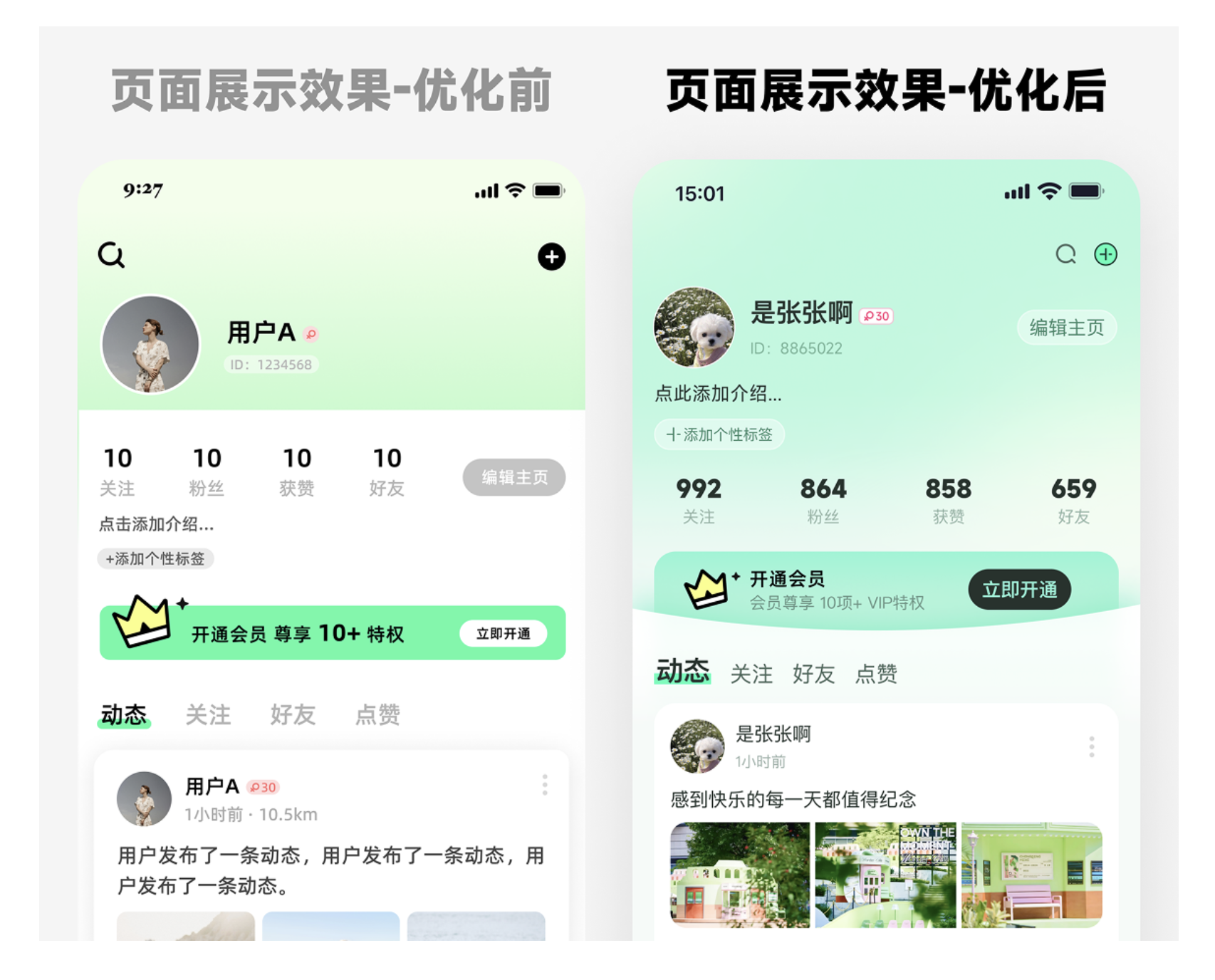 先看看優化前后的巨大反差:優化前的頁面,正綠色主色調刺眼,頭像與信息比例失衡,數據展示平淡,活動入口普通,動態卡片冗余信息多,導航欄單調;而優化后,色調柔和協調,布局緊湊飽滿,重點信息一目了然,整體質感直接翻倍。下面就拆解這 7 個核心優化思路,幫你避開 “踩坑點”。