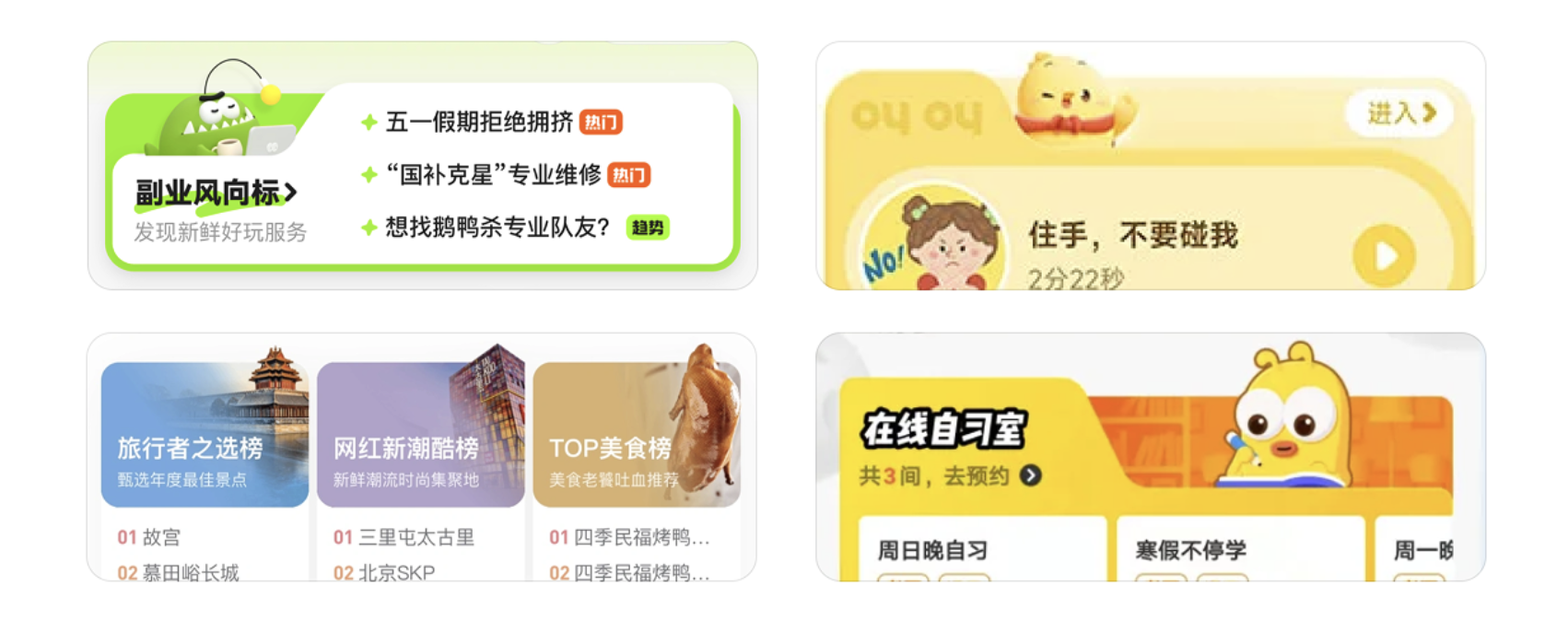比如外賣 APP 的首頁功能區,“外賣點餐” 是核心高頻功能,做超大卡片;“超市便利”“水果生鮮” 是次要功能,做中尺寸;“跑腿”“充值” 是輔助功能,做小尺寸。