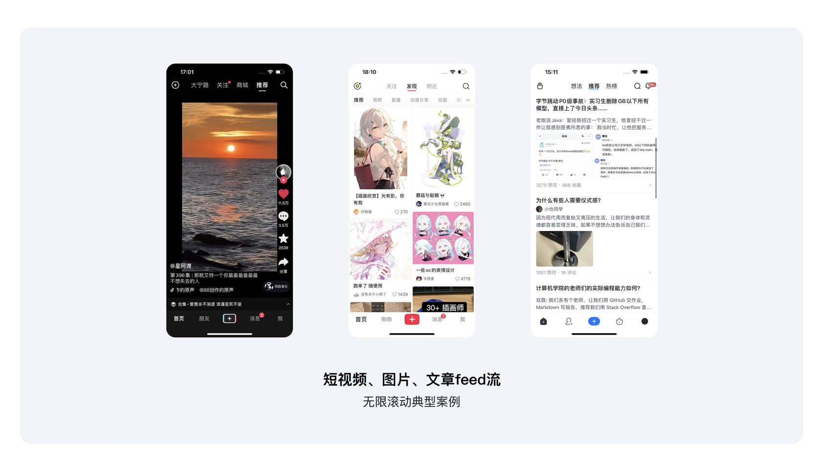 無限滾動(dòng)是短視頻和各類內(nèi)容平臺(tái)的核心設(shè)計(jì)之一,它通過算法實(shí)時(shí)推送新內(nèi)容,徹底消除了傳統(tǒng)頁面的翻頁按鈕和內(nèi)容終點(diǎn)。只要用戶不停下滑動(dòng)的手指,屏幕上就會(huì)一直出現(xiàn)新的內(nèi)容,這種設(shè)計(jì)讓用戶失去了對(duì) “內(nèi)容邊界” 的感知,總抱著 “下一條說不定更有趣” 的期待。
