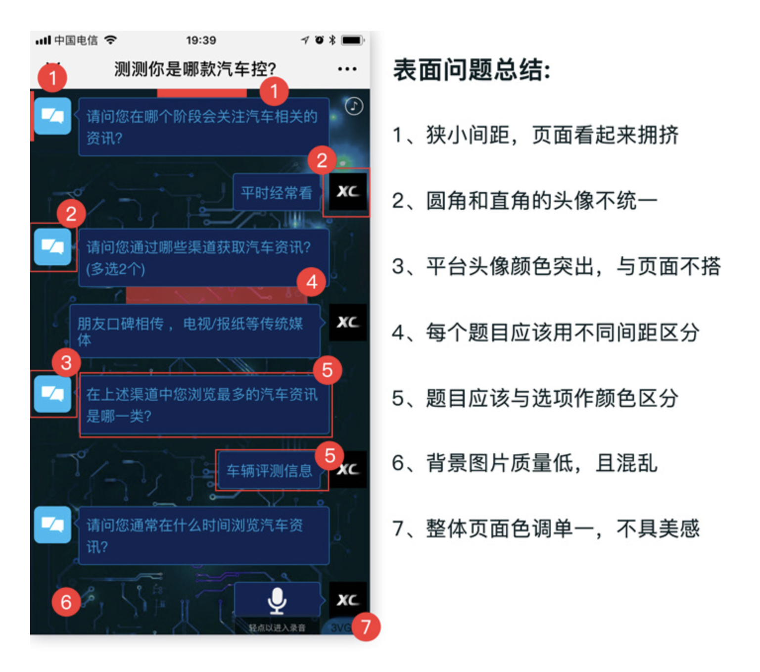 本次案例為一款以人機(jī)對話 UI(Conversation UI,簡稱 CUI) 為形式的汽車問答測評 H5,相較于傳統(tǒng)問答測評模式,該設(shè)計(jì)在形式上做出了創(chuàng)新,本應(yīng)具備體驗(yàn)優(yōu)勢,但實(shí)際落地后卻出現(xiàn)了諸多體驗(yàn)問題。先來看這份設(shè)計(jì)的創(chuàng)新優(yōu)勢,再逐一拆解其核心痛點(diǎn)。