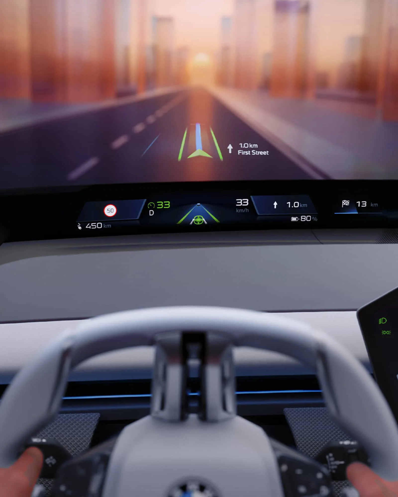 在汽車領域,多模態交互已成為部分車型標配。寶馬 Panoramic Vision、現代摩比斯全風擋全息 HUD 等設計,將整個擋風玻璃下沿變為顯示區域,結合增強現實(AR),將導航信息直接投射于路面。