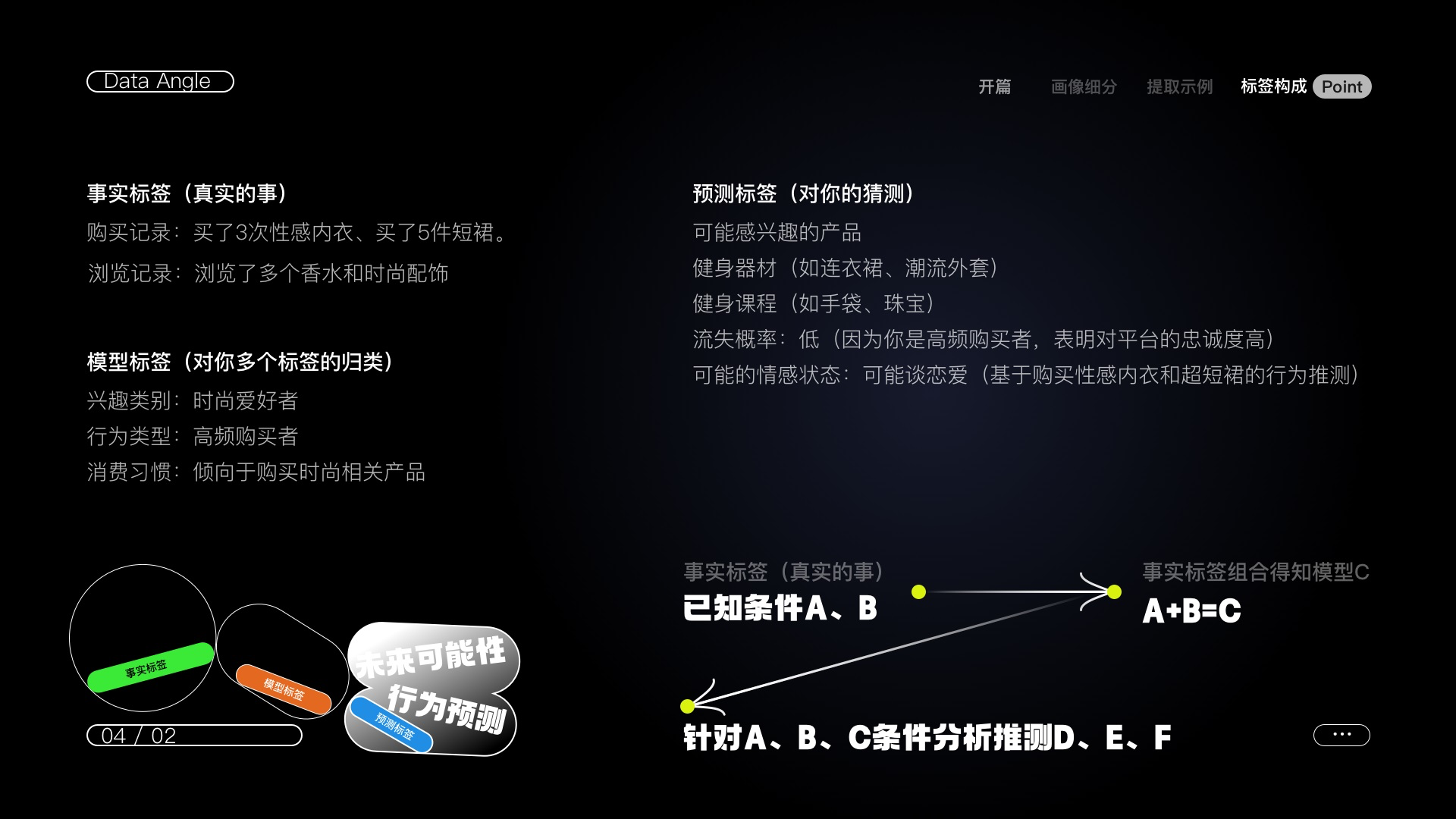 比如說你閨蜜是一個(gè)漂亮妹妹,情緒穩(wěn)定,平時(shí)也不介入你的情感生活(靜態(tài)標(biāo)簽:女、情緒穩(wěn)定、無(wú)男友)但在某次你和她吐槽你男票時(shí)她情緒變得無(wú)比激動(dòng)痛罵渣男并極力勸你分手!(動(dòng)態(tài)標(biāo)簽:情緒激動(dòng)、強(qiáng)烈反應(yīng)、關(guān)心朋友)那你會(huì)不會(huì)懷疑她想搞定你男票?(預(yù)測(cè)標(biāo)簽:對(duì)你男朋友的潛在興趣、對(duì)感情的需求)靜態(tài)標(biāo)簽為我們提供了閨蜜的基本信息,動(dòng)態(tài)標(biāo)簽反映了她在特定情境下的行為變化,預(yù)測(cè)標(biāo)簽則對(duì)她的潛在需求和動(dòng)機(jī)進(jìn)行了推測(cè)。這種分析能夠幫助我們更好地理解她的行為和可能的心理狀態(tài)。(故事胡編的、如有雷同純屬巧合)