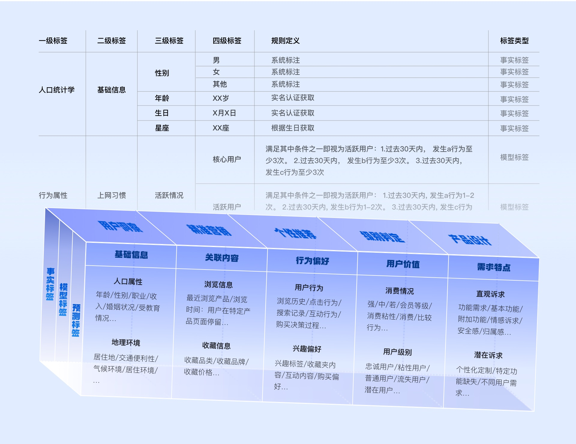 事實(shí)標(biāo)簽就是真實(shí)的,具體的事,其中也就是姓名啦、年齡啦、生日啦、居住地啥的等等,當(dāng)然其中還包含購(gòu)買記錄、瀏覽記錄。這些都是真實(shí)在用戶身上生效的事。舉例子來說你的女票問你談過幾個(gè)女朋友,你們都交往了多久,分手原因是啥等等,這就屬于在調(diào)取你的過往事實(shí)標(biāo)簽。