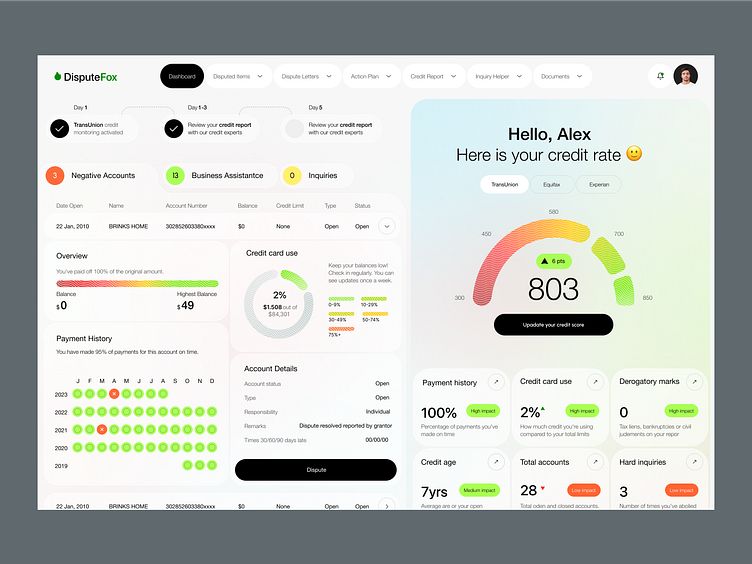 - 信息層級:以信用分 803 為核心視覺錨點,用弧形儀表盤直觀展示分數區間,同時拆解還款歷史、信用卡使用率等關鍵指標,讓用戶快速掌握信用狀態,契合北京蘭亭妙微 “專業數據輕量化呈現” 的設計理念。