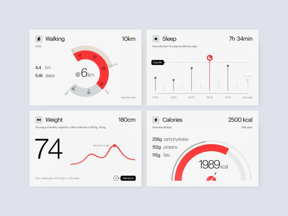 - 正向反饋:用綠色標注達標數據,用紅色提示睡眠不足,用 “Well done” 等文案強化正向激勵,貼合健康產品 “陪伴式管理” 的定位。