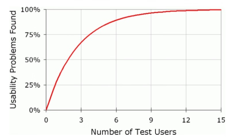 諸如此類的樣本數量“挑戰”,不勝枚舉。人機交互博士 Jakob Nielsen 曾提出:“有 5 個人參加的用戶測試,即可發現大多數(85%)的產品可用性問題。” Nielsen 這張經典圖表(如下圖)告訴我們答案:一般最嚴重的問題都是前幾名用戶發現的,隨著用戶數量增多,發現問題逐漸減少。