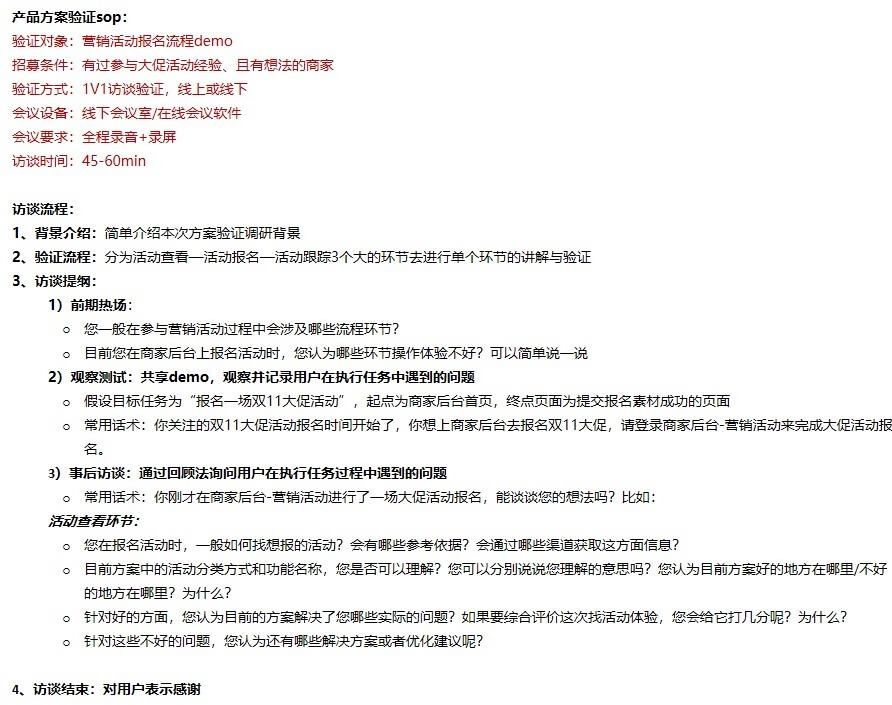 可用性測試的基礎是任務,任務測試內容的好壞是能夠對測試結果的準確性有直接影響的。因此在招募用戶之前,需要對測試的產品方案進行任務設計。比如,測試商家在 B 端營銷系統報名營銷活動流程方案的任務可以是:報名一場雙 11 大促活動。