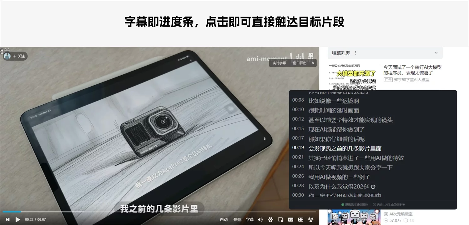 而 AI 播放器中,可以把識別到的字幕,加入到進度條中作為錨點,讓用戶根據具體的字幕內容,就可以精準定位并直達該進度點,找片段的效率大大提升,直接使體驗升維。