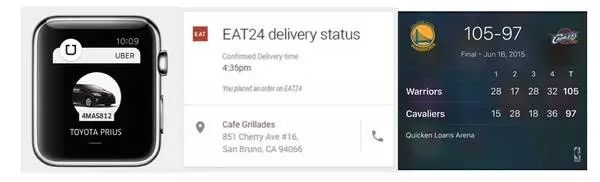 通知會以更「智能」的形式出現(xiàn),不會是現(xiàn)在的小廣告推送形式,也不會是類似 Widget 常駐的形式,而更接近「手表屏幕」大小,按需出現(xiàn),可交互的、功能相對完整的界面(即使是在手機上而不是手表上),用戶甚至可以永遠不打開一個 App,而能夠享受 App 提供的全部功能。