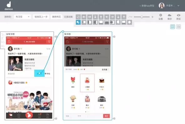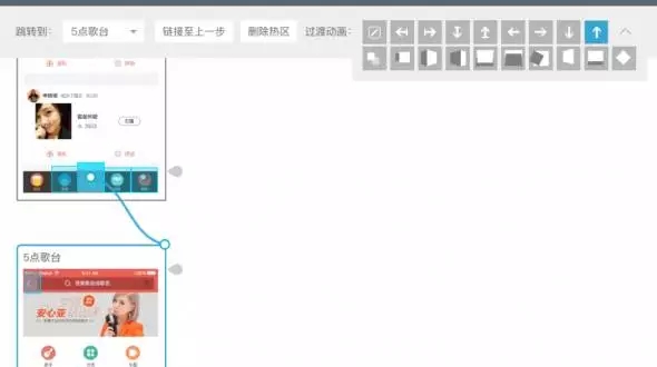 真實的app中,頁面間常常通過方向來示意層級關系,例如重新創建的流程,通常創建頁面會從底部向上呼起,于是,在建立熱區鏈接過程時,我們需要對鏈接進行方向設定。如圖示,我將點歌臺呼起的頁面出現形式,設定為從下往上出。如果不是很確定切換效果,Demoo很細心的在這里設計了動畫預覽,鼠標停留在小方塊上時,會有微動畫示意,多看幾遍也就明白了。